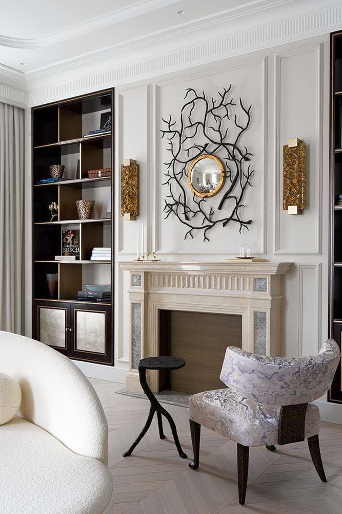 Над камином бюро Полины Пидцан нередко располагает зеркало с бра по бокам. Такой прием позволяет «приподнять» свет в этой зоне и заполнить помещение. При высоких потолках это смотрится особенно выигрышно.