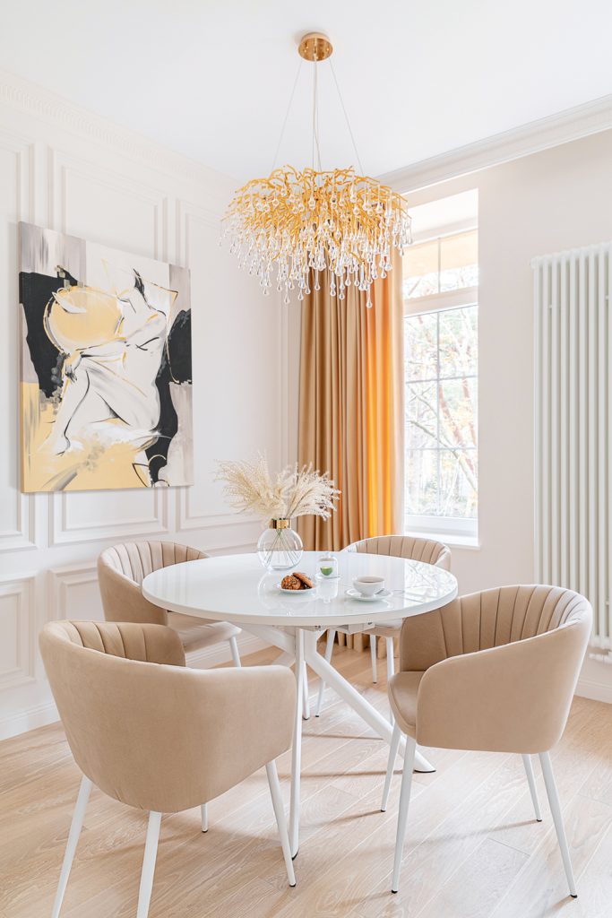 Обеденная зона получилась уютной и камерной. Срежиссировать световые сценарии в проекте помог салон «Центр света», подобрав для каждой зоны уникальное и выразительное решение. И один из самых эффектных светильников – золотые хрупкие веточки с каплями-слезинками – украсил именно столовую зону. Его свет собирает вокруг себя всех домочадцев за круглым столом. Ансамбль дополнили обеденными креслами с мягкой обивкой, изголовье и подлокотники которых словно заключают сидящего в свои радушные объятия. С выверенной колористикой проекта – светлые тона, сияющее золото, драматические тёмные акценты – вступает в контакт картина Натальи Фоминовой, собирая воедино все эти оттенки.