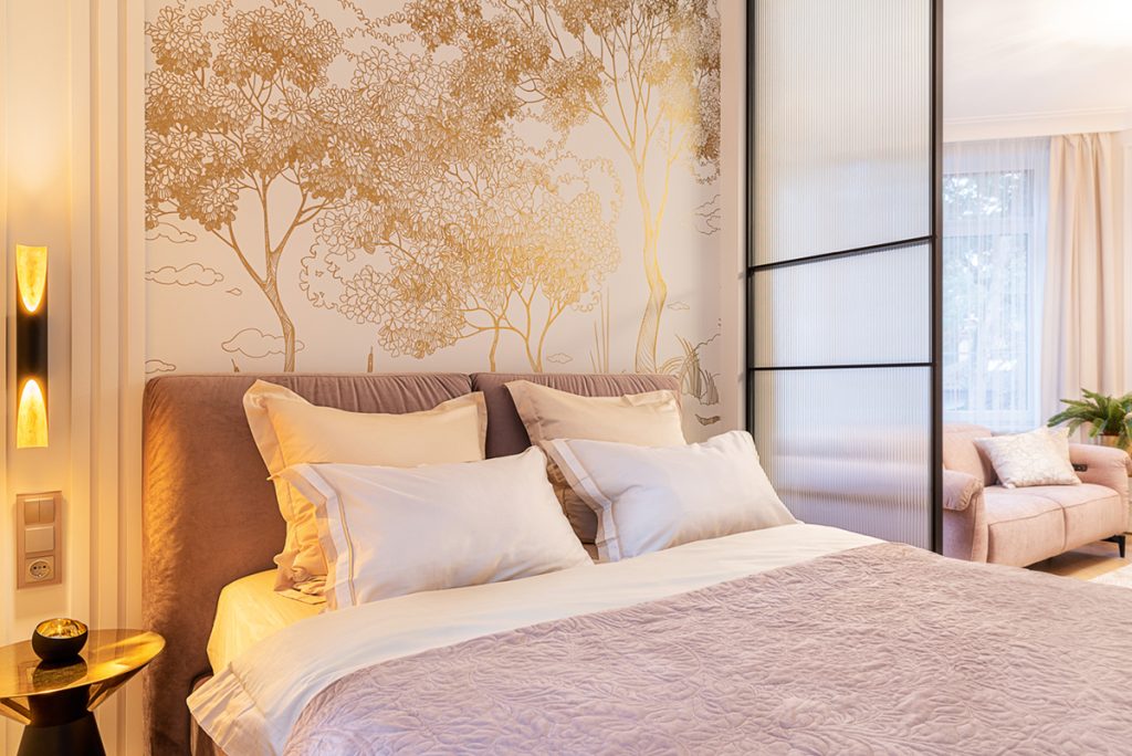 Одной из основных задач, стоящих перед Евгенией Хрящевской, была организация большого количества спальных мест. Поэтому дизайнер предусмотрела не только изолированную маленькую спальню, но и спальню с эркерным окном, где может разместиться дочь с семьёй. Светлое помещение дополнили золотыми акцентами, начиная от рисунка на обоях и заканчивая приобретёнными в салоне «Престиж мебель» оригинальными прикроватными столиками Garda decor и подставкой для цветов. Мягкое кресло от «Архидеи», шикарные комплекты текстиля и постельного белья от Textile lab – каждая нота здесь звучит расслабленно и умиротворённо.