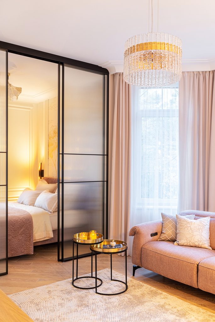 Но настроение комнаты легко поменять. Подвесная перегородка RAUMPLUS S1200 Air из рифлёного стекла в графичной раме одним движением скрывает спальную зону, а пространство используется для отдыха: здесь можно играть с внуками или читать книгу, устроившись на мягком диване от салона «Престиж».
