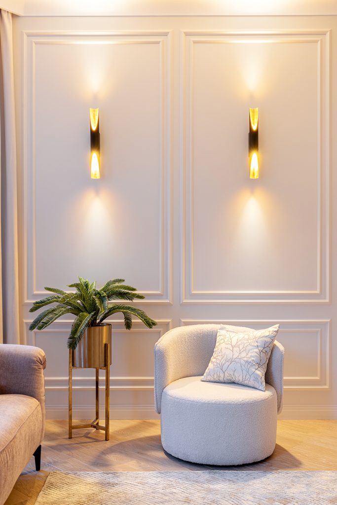 В мягких сливочных оттенках плещется золото, а тонкие прямые линии, словно корсет, поддерживают величественную осанку интерьера.