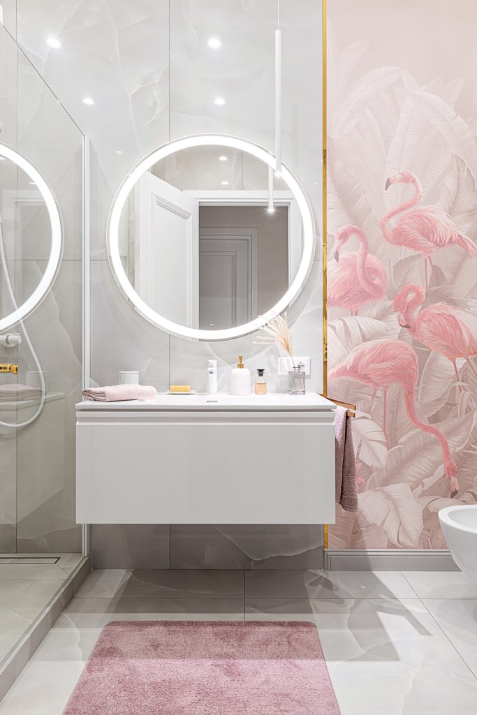 В оформлении ванной автор проекта использовала свой любимый приём. В салоне керамической плитки «Модуль» Евгения Хрящевская выбрала плитку под оникс, и его восхитительная текстура раскрылась ещё глубже, будучи дополнена акцентными обоями с изображением фламинго в том же оттенке.