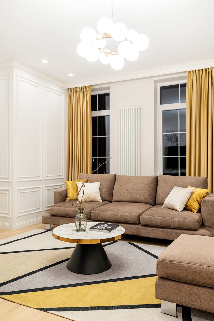 Одним из самых заметных акцентов в гостиной стал ковёр (все ковры для проекта приобрели в салоне «Престиж мебель»). Следуя за тёмными ломаными линиями, мы направляем взгляд к удобному угловому дивану. Продолжая движение, наслаждаемся красотой ТВ-зоны с подсвеченной стеной из широкоформатного керамогранита от салона «Модуль»; а финальную точку ставят круглый стол на массивном основании и пуф, выбранный в салоне «Престиж мебель». Пуф удачно рифмуется с банкеткой в холле, также приобретённой в салоне.