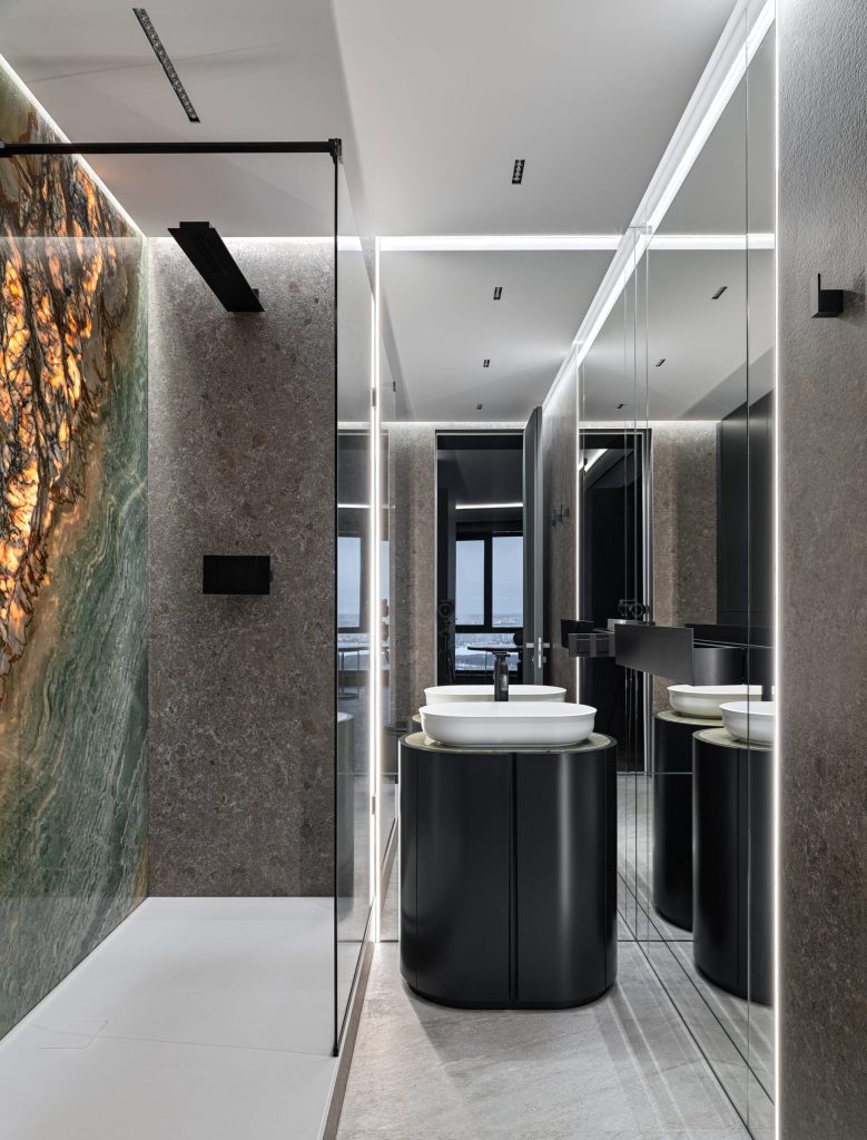За создание в мастер-ванной особой атмосферы, где главенствует роскошь и элегантность, отвечают все без исключения детали – от итальянской сантехники AGAPE до стильной мебели, но главным героем пространства становится изумительной красоты кварцит «Рио Гранде».