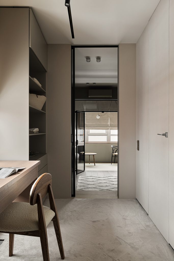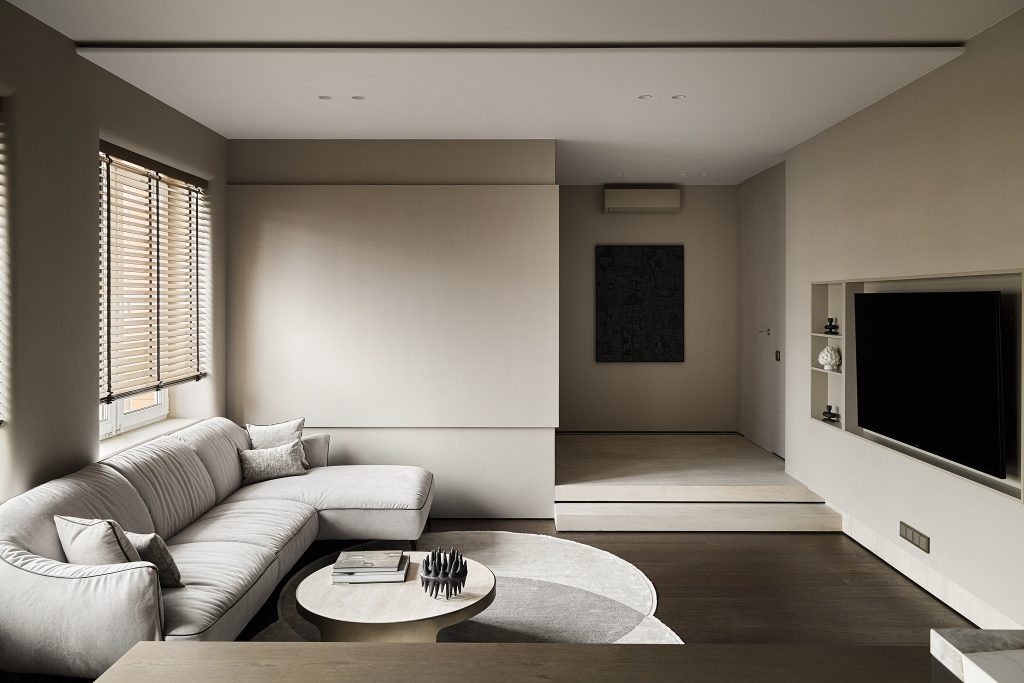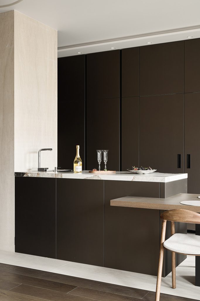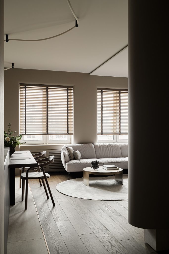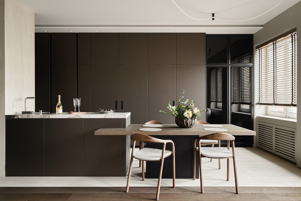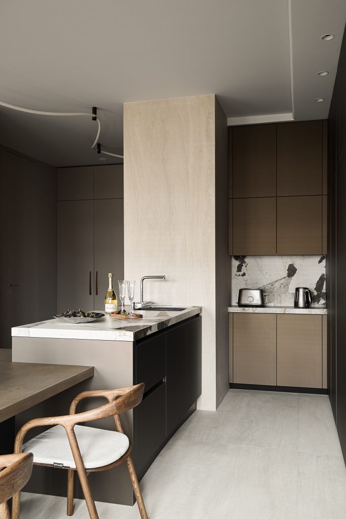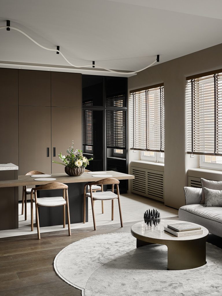 Зона кухни-гостиной выполнена в минималистичном стиле, скрывающем кухонные принадлежности за аккуратными фасадами, что создаёт эффект абсолютной чистоты и порядка. Тёплые оттенки отделки стен, мебели и текстиля, дополненные натуральными материалами вроде дерева и камня, наполняют пространство естественным очарованием природы.