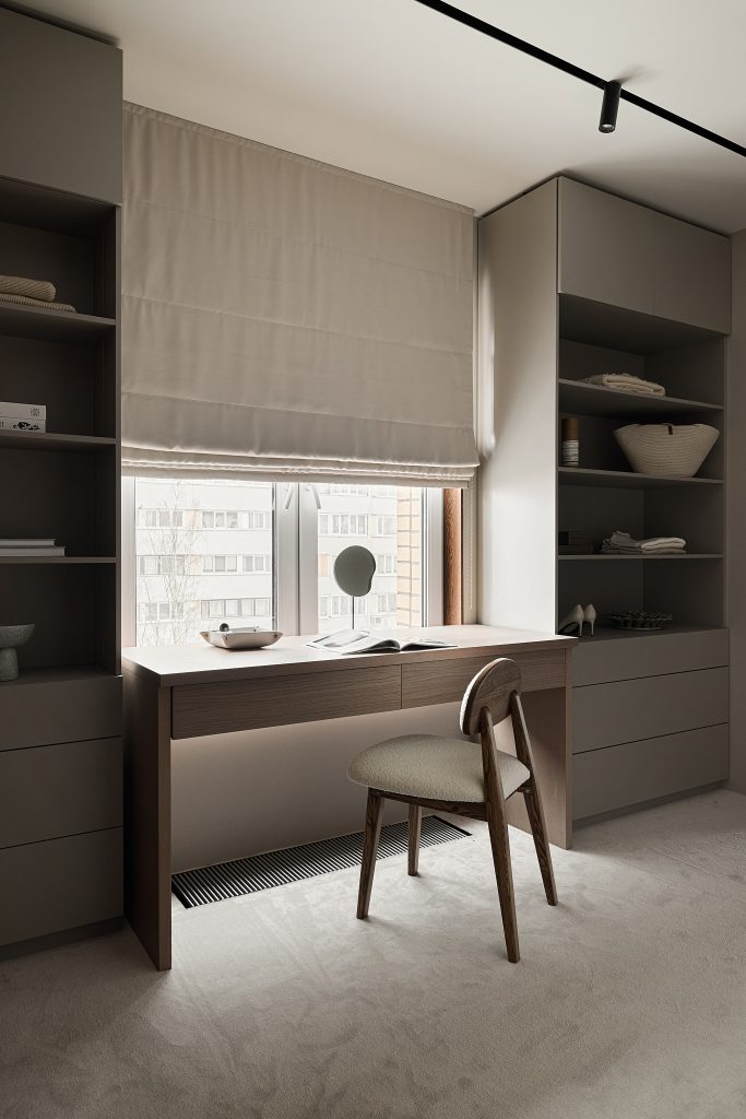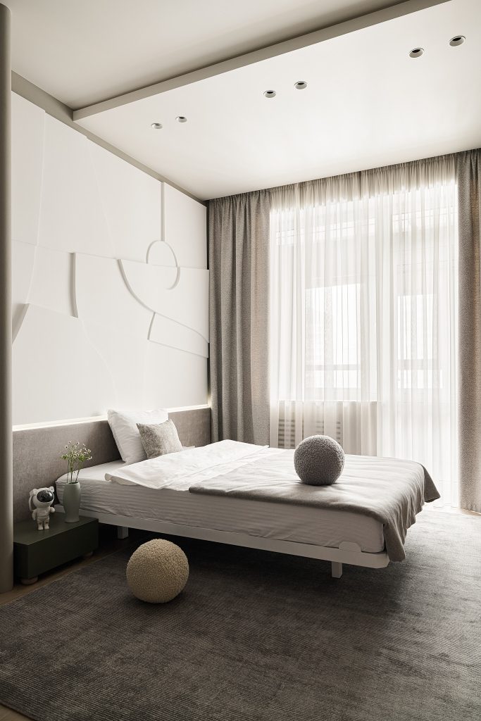 Особым вниманием уделяется освещению. Встроенные светильники рассеивают мягкий свет, подчеркивая текстуры материалов и создавая приятную атмосферу расслабления. Особенно притягательно выглядит освещение над кроватью, где ботаническое панно с отпечатками живых растений добавляет нотку романтики и свежести.