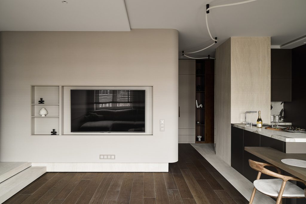 Зона кухни-гостиной выполнена в минималистичном стиле, скрывающем кухонные принадлежности за аккуратными фасадами, что создаёт эффект абсолютной чистоты и порядка. Тёплые оттенки отделки стен, мебели и текстиля, дополненные натуральными материалами вроде дерева и камня, наполняют пространство естественным очарованием природы.