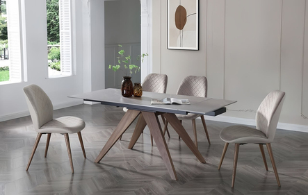 Стремительные линии и приятная цветовая гамма, сочетающая серый и ореховый оттенки, отличают раскладной стол «Валенсия». Столешница из 12-миллиметровой керамики не впитывает влагу и легко очищается.