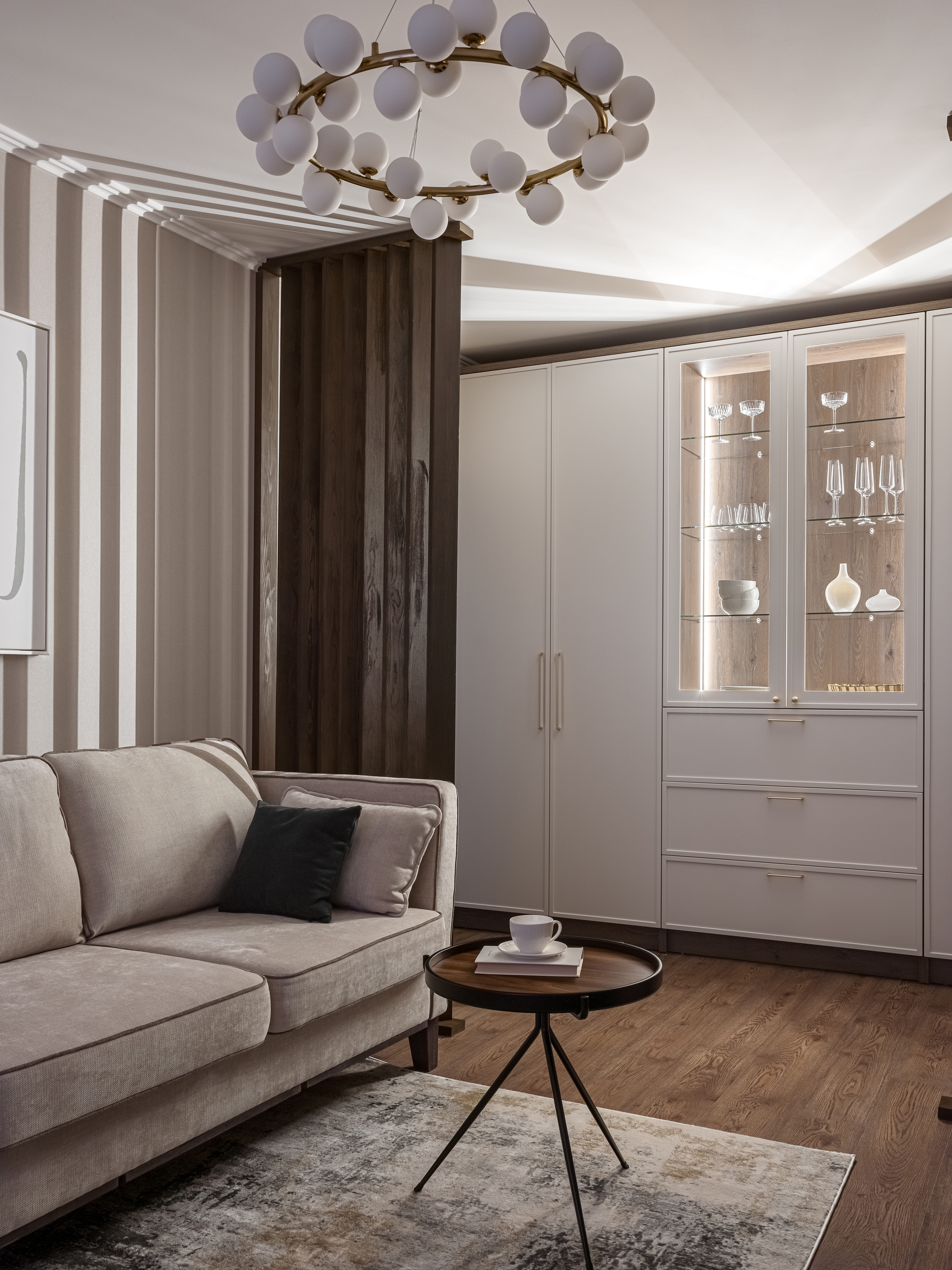 Композиционно гостиная решена очень выразительно – формы неявно, но интересно перекликаются. Журнальный столик в центре рифмуется с абажуром торшера и круглой люстрой, а шторы нежного кремового оттенка находят себе неожиданное «отражение» напротив – расположенную по обе стороны входа деревянную реечную перегородку. Ее выполнили в темном цвете – такое решение приковывает внимание к витрине с фасадами из МДФ в эмали. Особенно эффектно этот ансамбль смотрится в вечернее время, когда подсветка витрины просачивается сквозь узкие отверстия перегородки, наполняя пространство игрой теней.