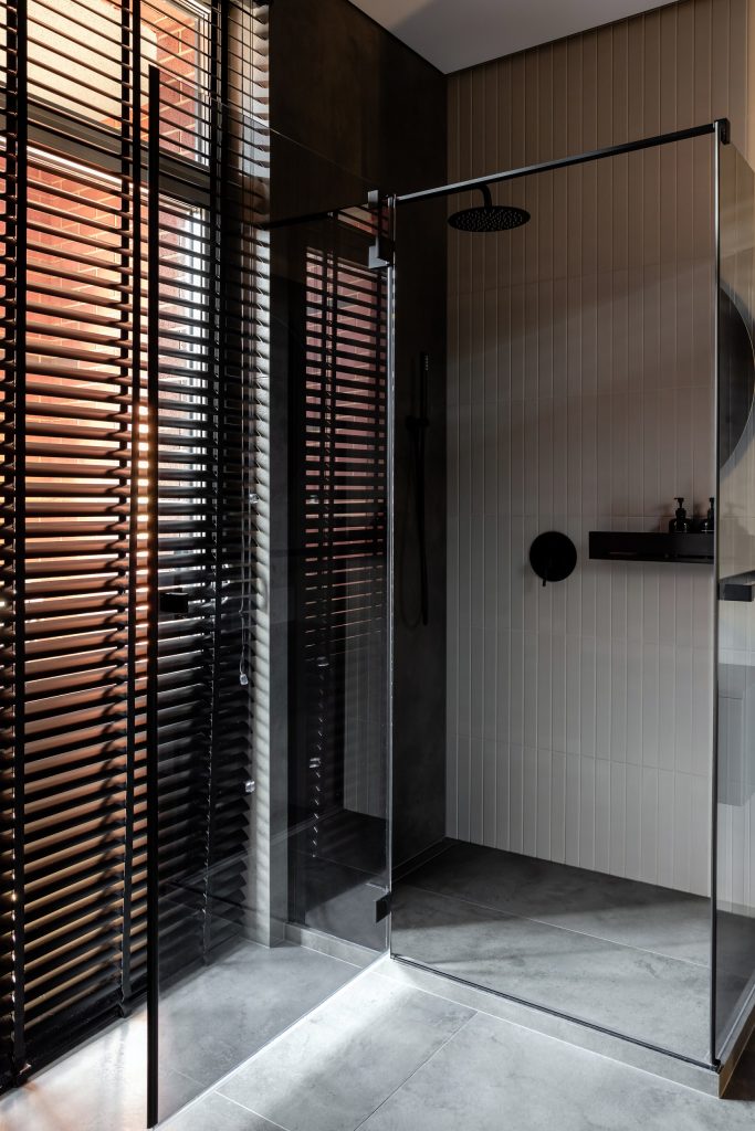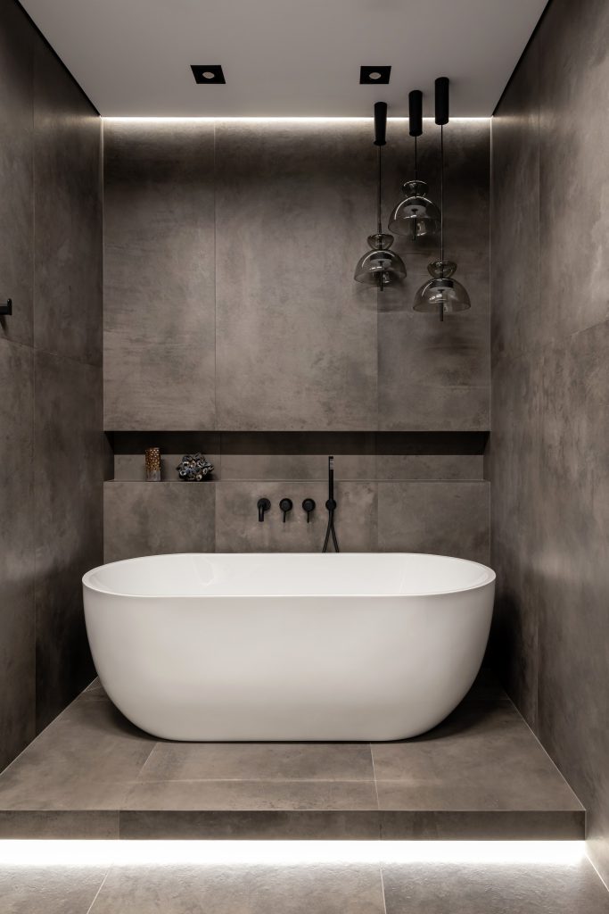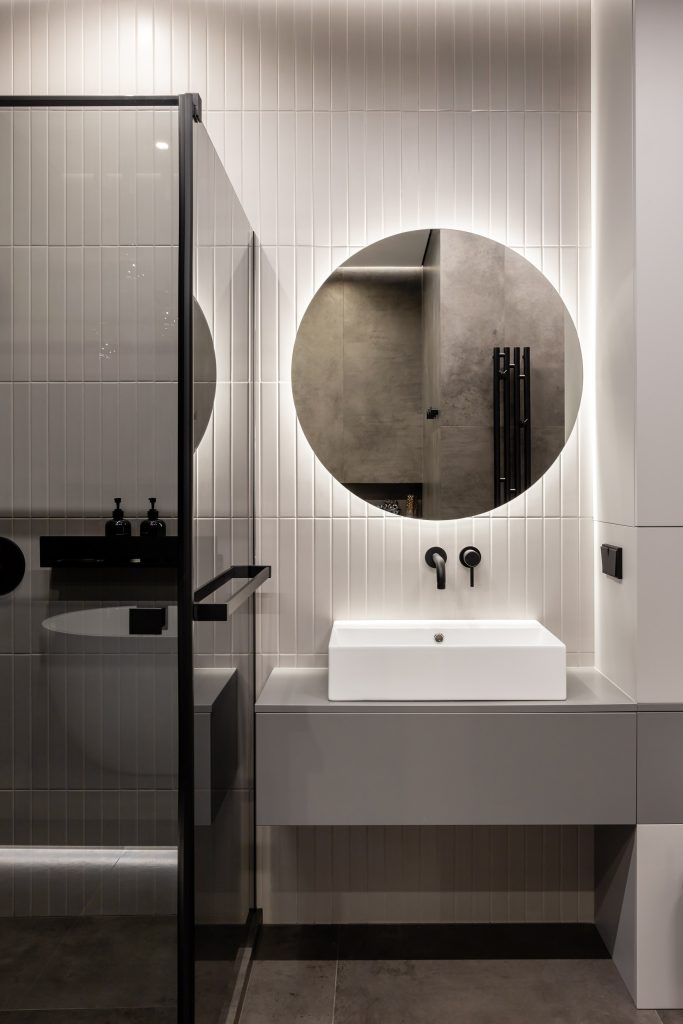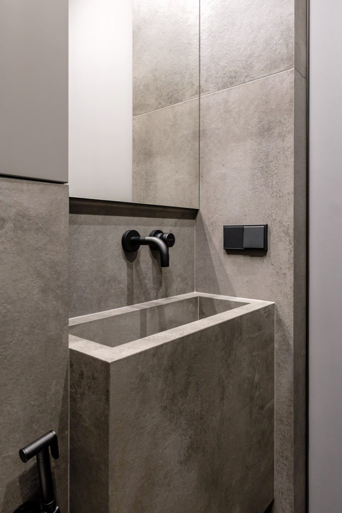 Что касается главного санузла, то застройщиком предполагалась зона для сауны. Владельцы квартиры хотели иметь в мастер-зоне большую ванную комнату с отдельной душевой, поэтому помещение сауны было объединено с санузлом. Керамогранит дымчатых тонов, сияющая белая сантехника, тёмные элементы образовали современный элегантный ансамбль, позволяющий расслабиться и превратить рутинные гигиенические процедуры в особое наслаждение. Свет, пусть и искусственный, здесь тоже выступил как полезный инструмент работы с настроением и восприятием.