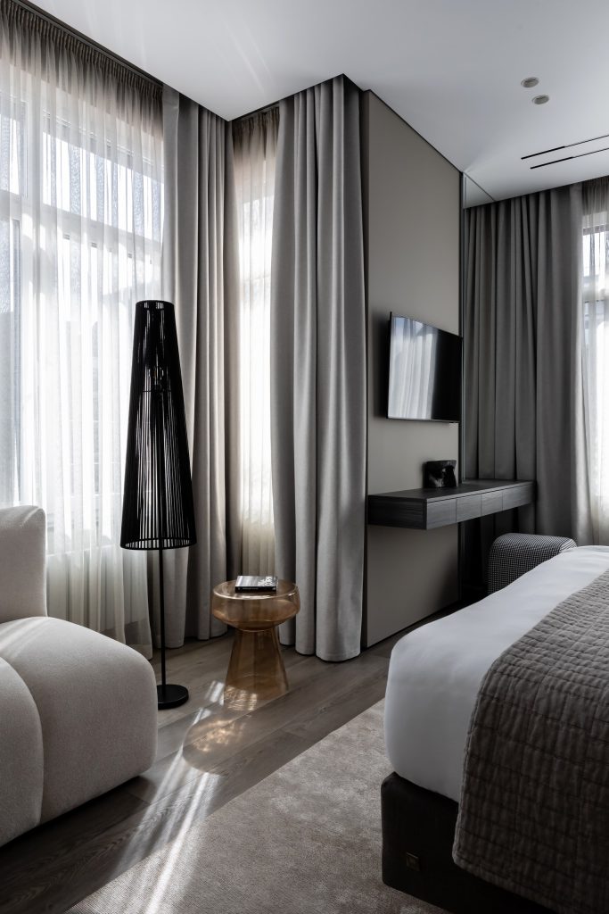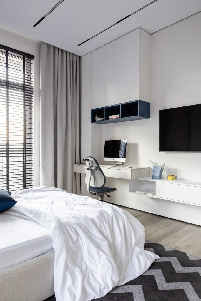 Даже в сдержанных респектабельных пространствах детские комнаты, как правило, делают более активными — по цвету, формам или фактурам. В этом проекте дизайнеры воспользовались приёмом контраста, комбинируя резкие линии и плавные очертания, светлые и тёмные тона, уютные текстуры и строгие графичные детали. Такой интерьер всегда будет выглядеть свежо и интересно и не потребует кардинального обновления по мере взросления детей. А с помощью ярких индивидуальных акцентов юные владельцы могут создавать на своей территории самое разное настроение.
