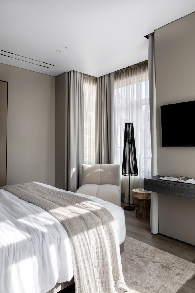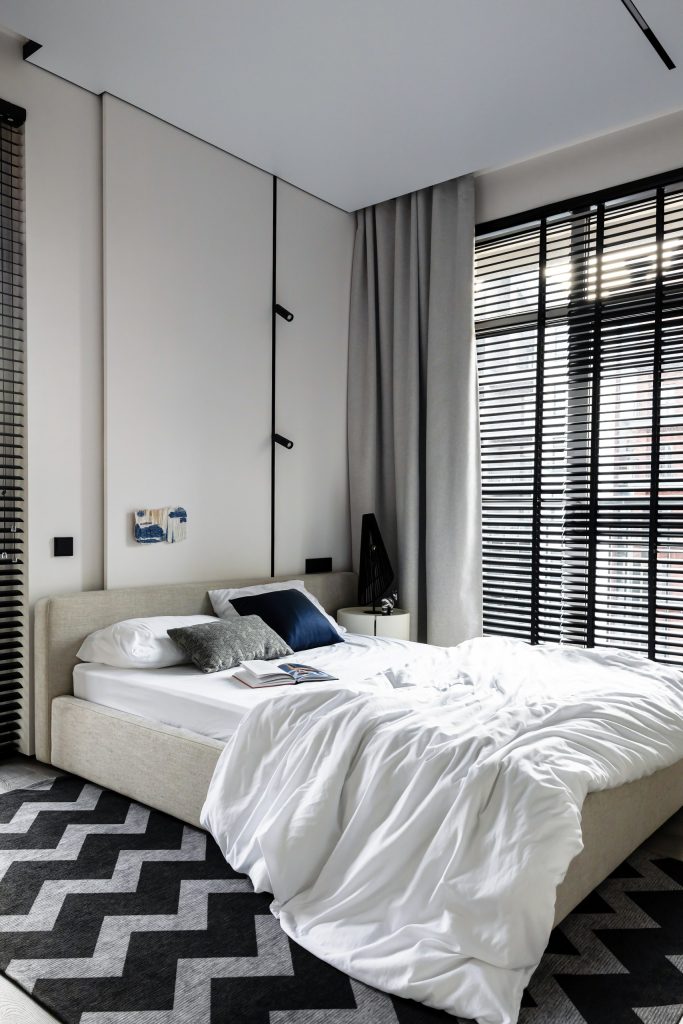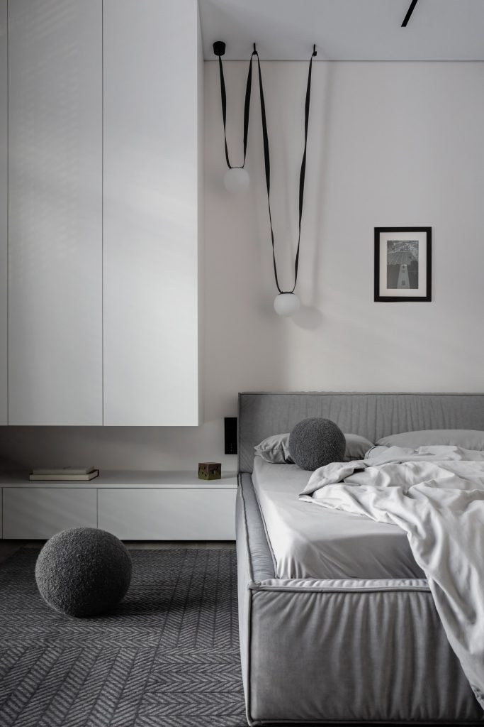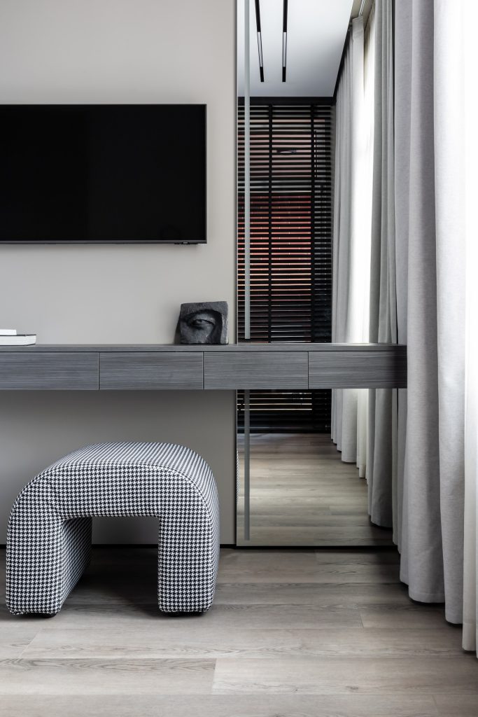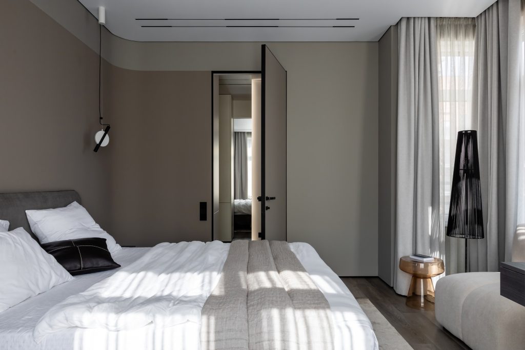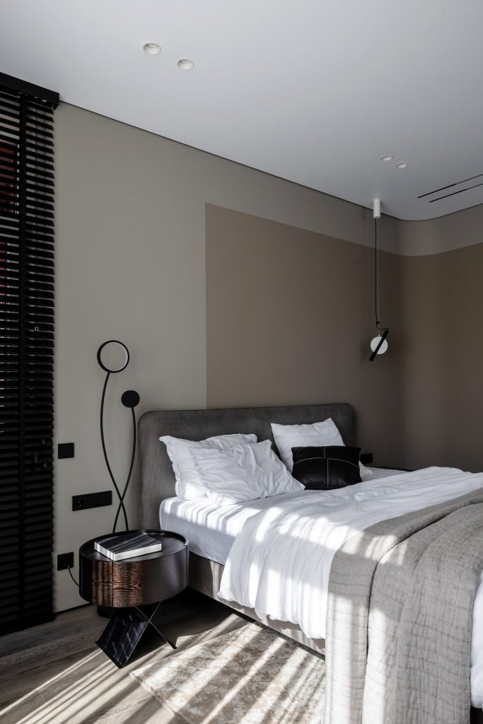 Оформляя мастер-блок, Валерия Романовская и Карина Ерёмина выдержали общую концепцию актуального, лаконичного, функционального интерьера. Элегантность и сдержанность спальни прежде всего выражены в гамме, и здесь дизайнеры использовали интересный приём сочетания нескольких оттенков: один тон широкой полосой заходит «во владения» другого, делая пространство гибким и живым и сглаживая особенности геометрии комнаты. Мебель простых форм, приятные фактуры, несколько сценариев освещения и нетривиальные акценты — вот формула успеха этого выверенного интерьера.