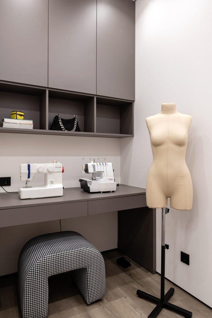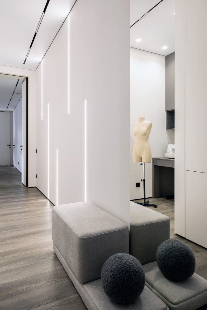 Молодые супруги с двумя детьми живут насыщенной жизнью, находя время и для семейного общения, и для своих хобби: большого тенниса, игры на акустической гитаре, шитья. Поэтому пространство должно было решать множество задач, в том числе наличие у каждого домочадца своей территории и присутствие систем хранения, вместительных, но незаметных. По цветовому предпочтению заказчикам была ближе всего спокойная гамма, где светлую базу дополнят тёмные акценты.