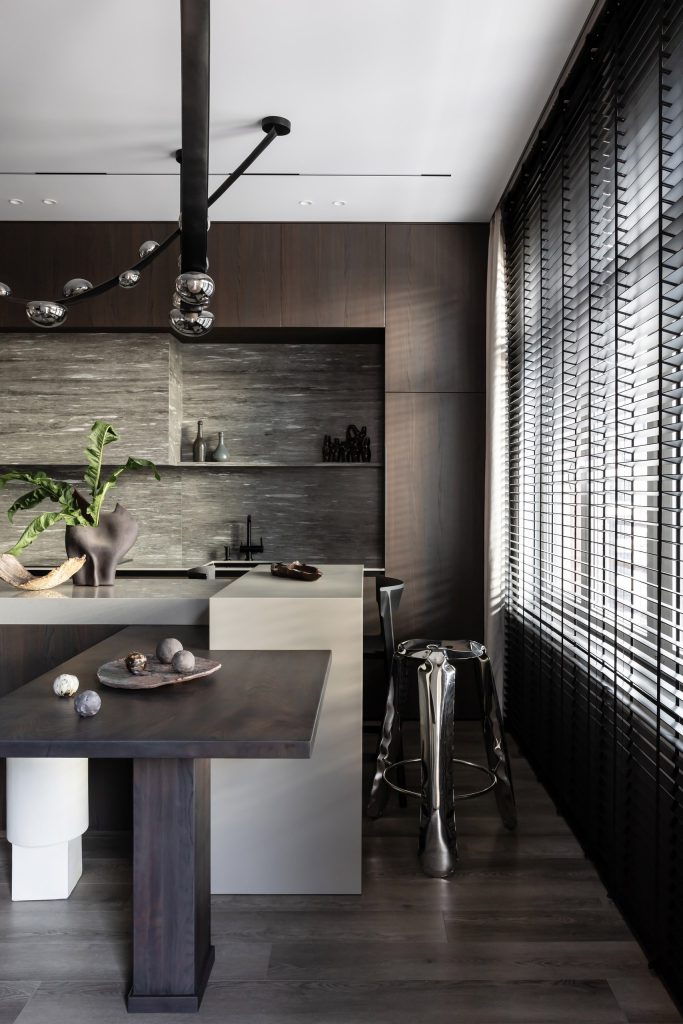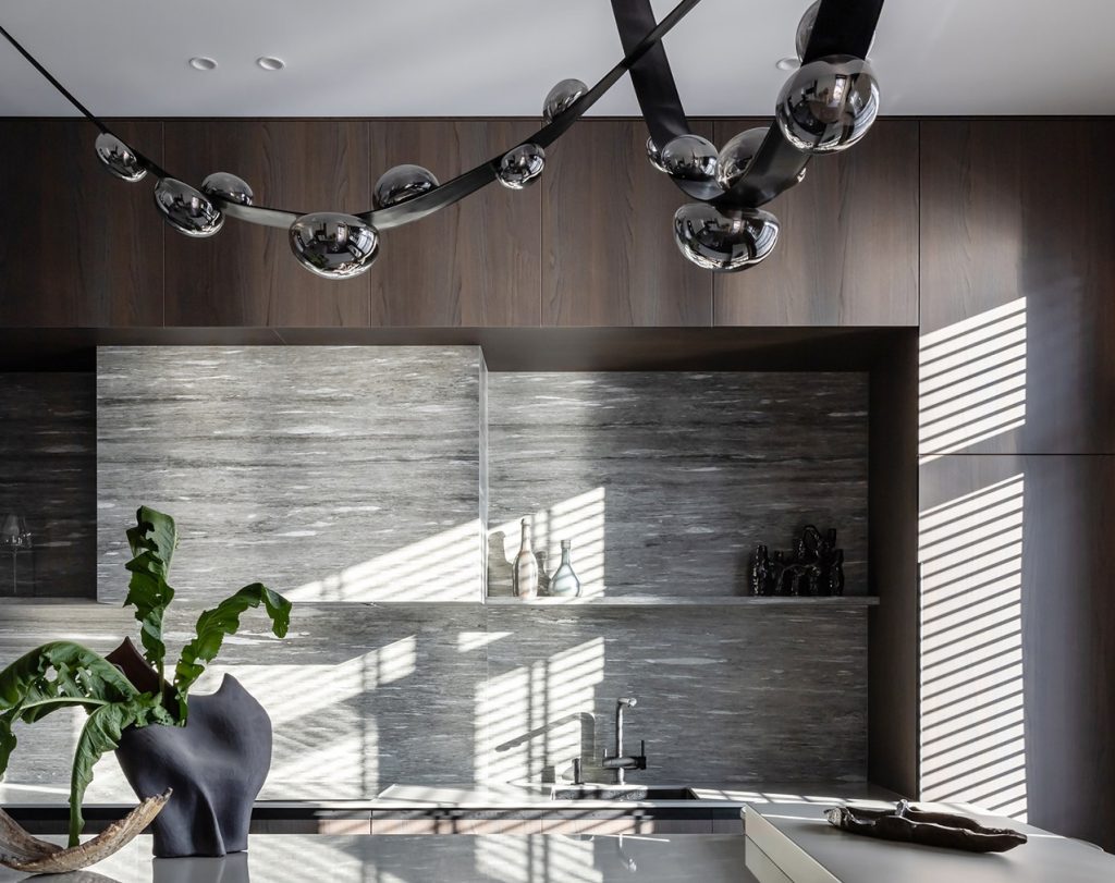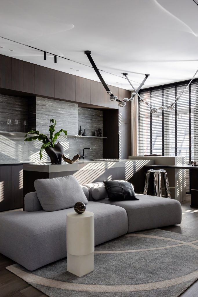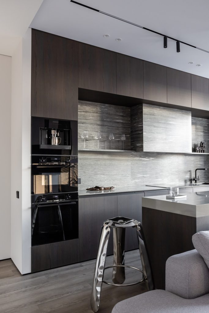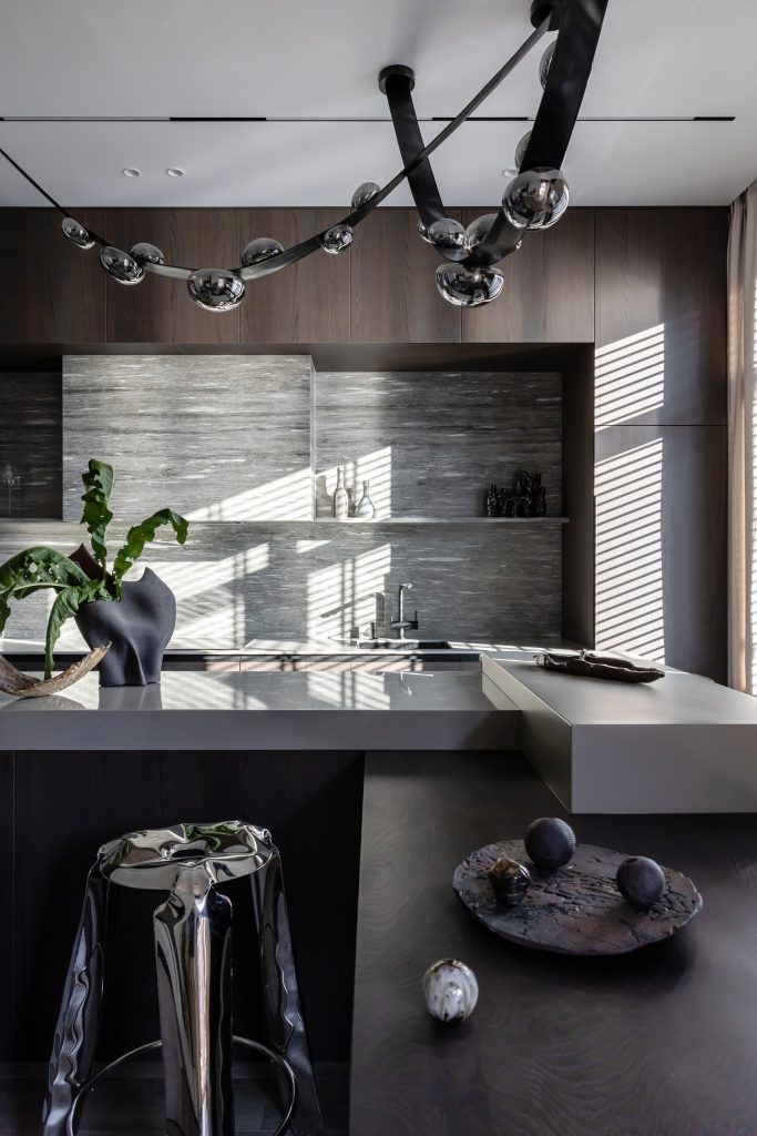 Авторы проекта сделали интерьер очень цельным: так, они объединили зону «острова», барной стойки и обеденного стола. Конструкция получилась очень функциональной и позволила визуально очертить зону кухни. Гарнитур отличает минималистичность и монолитность: для этого потребовалось скрыть вытяжку в коробе и оформить его тем же керамогранитом, что и на «фартуке».