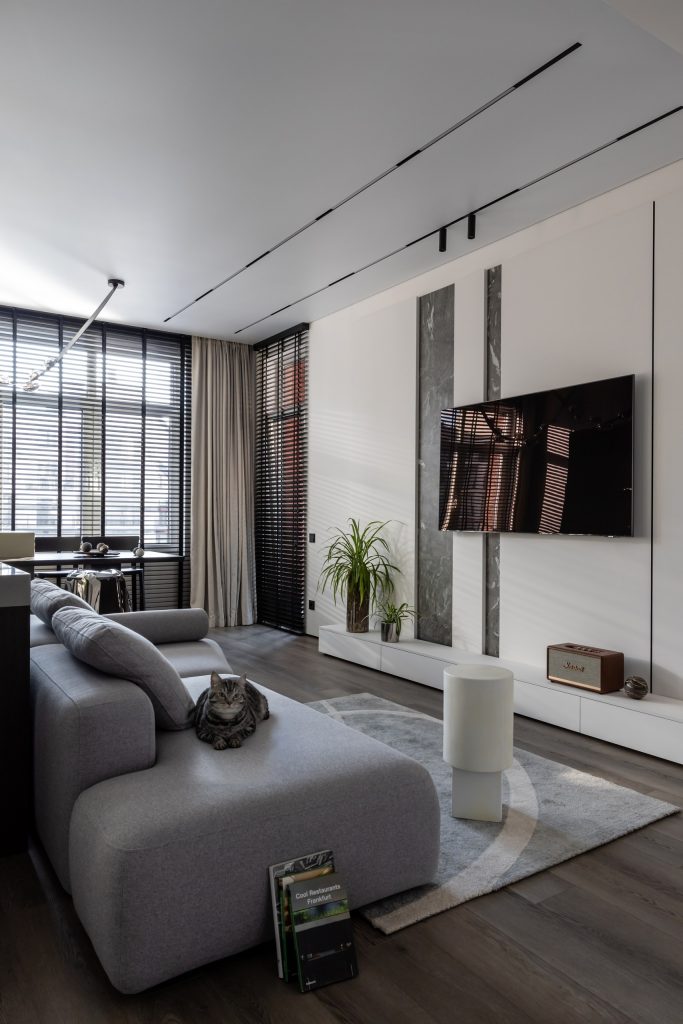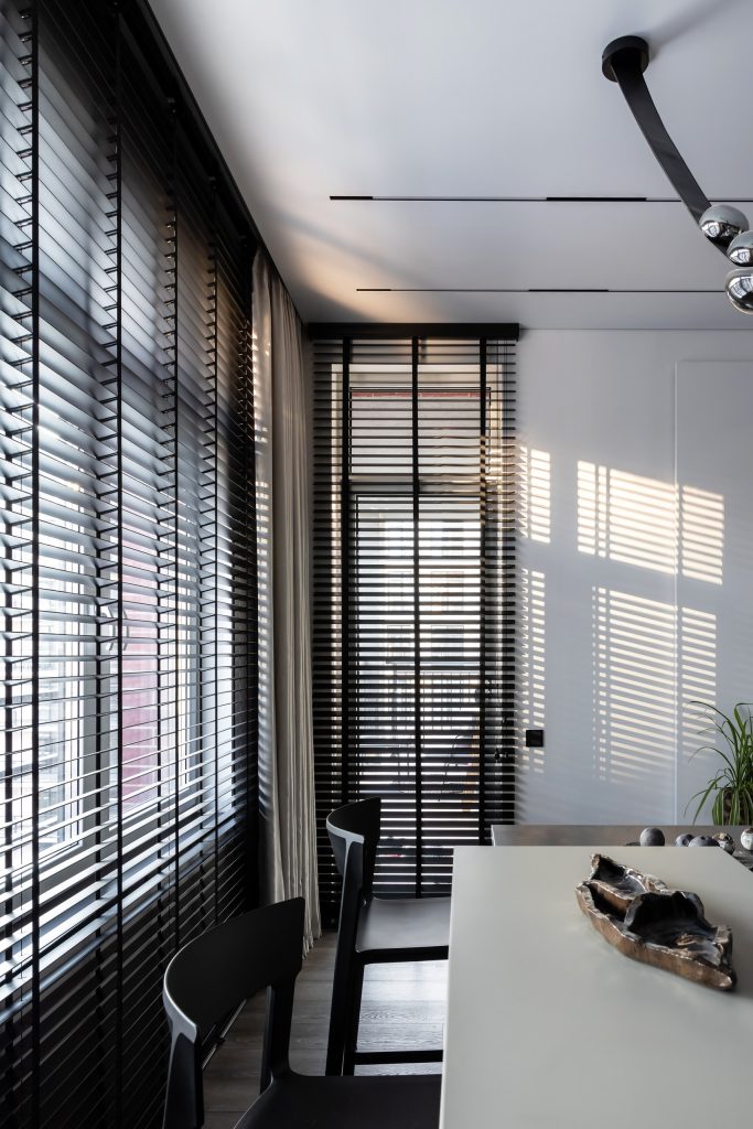 Изначально удачную планировку сохранили практически без изменений: в центре располагается кухня-гостиная, откуда попадаешь в две приватные части квартиры: мастер-блок (спальня, душевая, сауна, гардеробная) и детская территория (две спальни, санузел и прачечная). Интерьер общественной зоны получился сдержанным, но не монотонным: за счёт больших окон, дополненных графичными жалюзи, пространство всегда смотрится подвижным, изменяющимся, новым, а оттенки серого приобретают разную тональность.