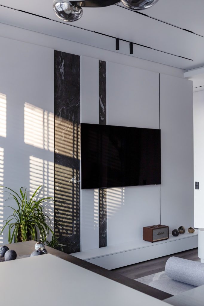 Команда бюро IDEA interior design с особой требовательностью подошла к декоративным решениям, чтобы интерьер был современным и оригинальным, но не перегруженным. Особенно выигрышно в пространстве смотрятся глянцевые поверхности: от необычного барного табурета до стильного светильника.