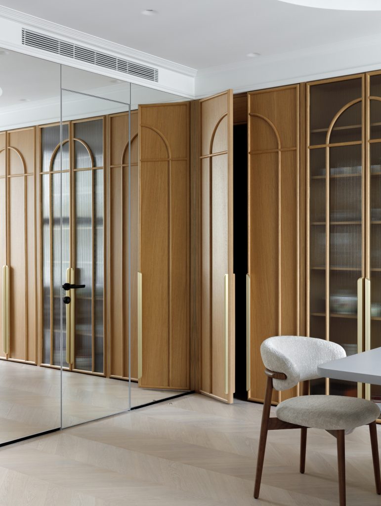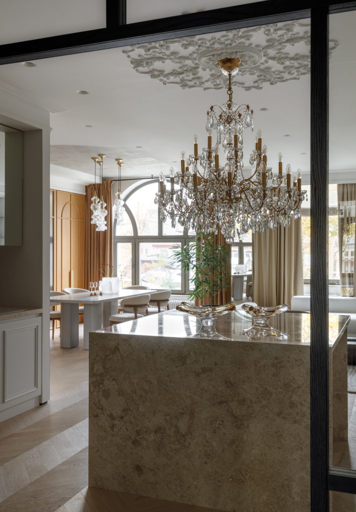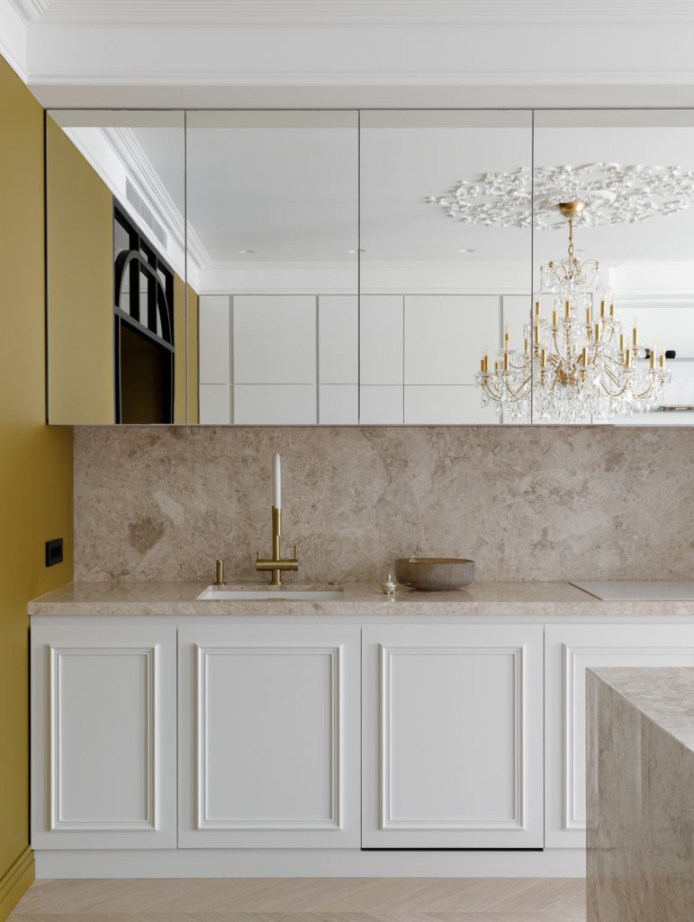 Дизайн сочетает классические черты в оформлении деталей, мебели и декора с минималистичными элементами гладкой отделки стен, зеркалами и лаконичностью фасадов.