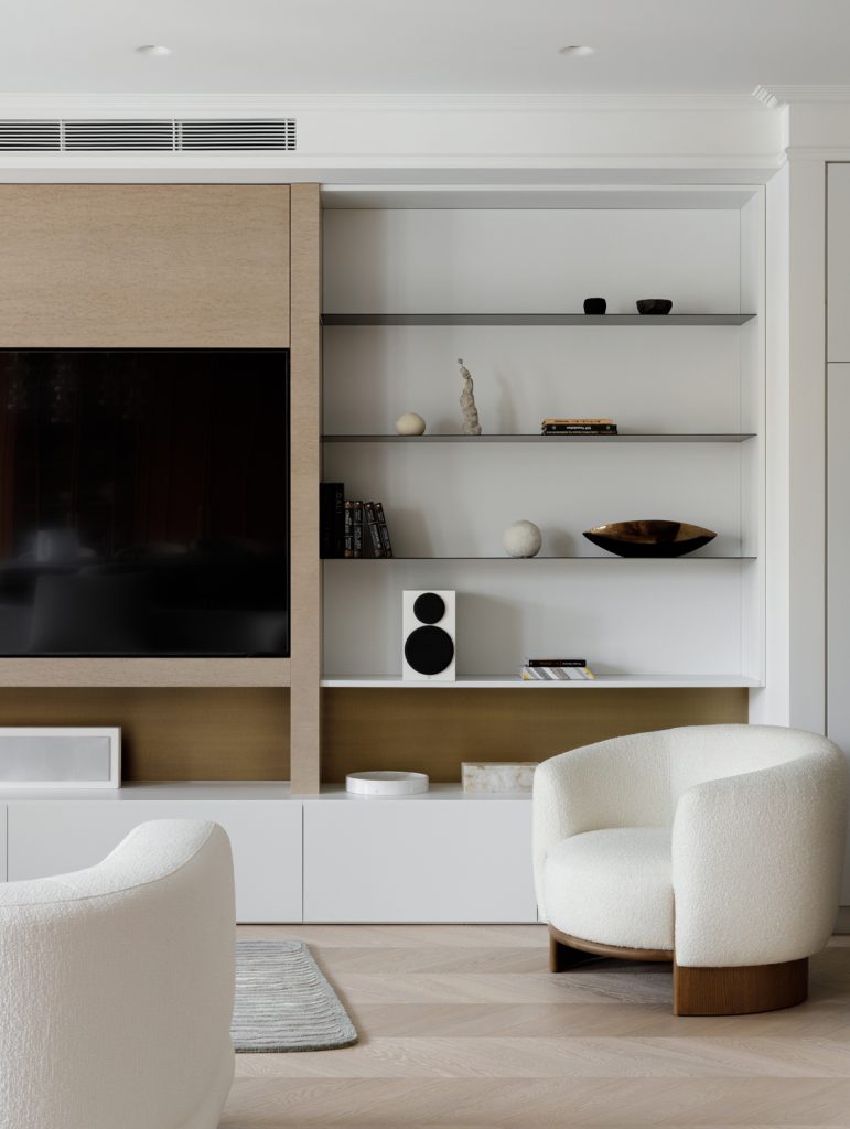 Задача проекта заключалась в объединении двух квартир в единое пространство, сохранив при этом функциональность и комфорт каждого помещения. Мы решили разделить жилое пространство на две чётко обозначенные зоны: публичную и приватную. Первая включает просторную гостиную, удобную прихожую, функциональный гардероб и оборудованный санузел для гостей. Вторая зона представляет собой два детских пространства, родительскую спальню, уютные ванные комнаты и хозяйственный блок.