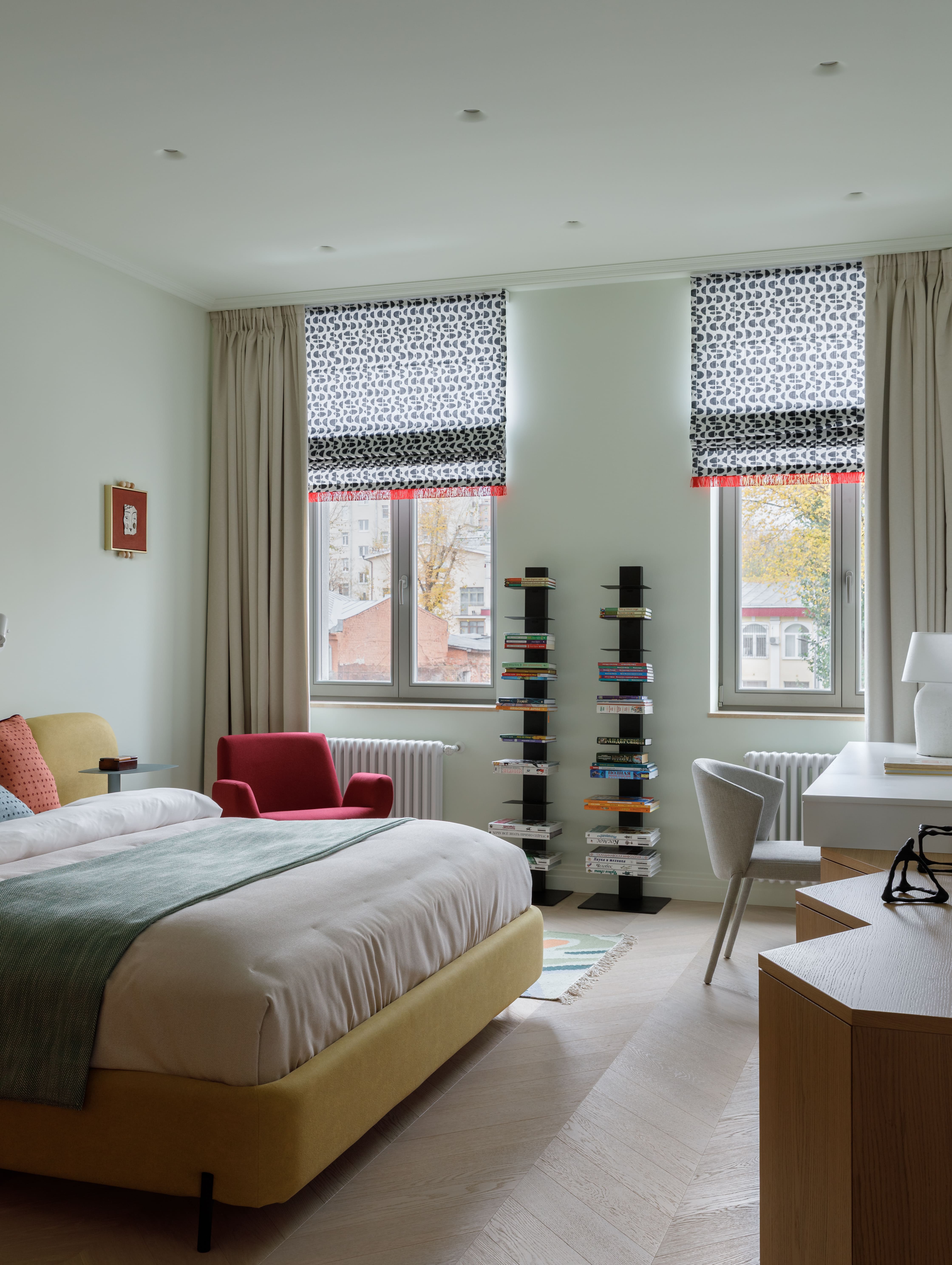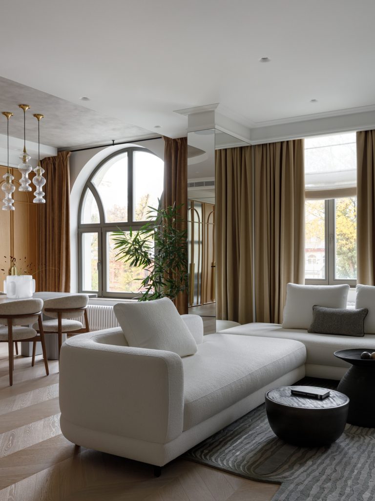 Архитектурная особенность окон, выполненных в форме арок, стала отправной точкой для интерпретации круглых форм в интерьере.