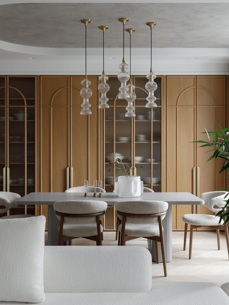 Радиусные линии повторяются в декоративных перегородках, филёнках шкафов, округлой спинке диванов и потолочных конструкциях над обеденным столом.