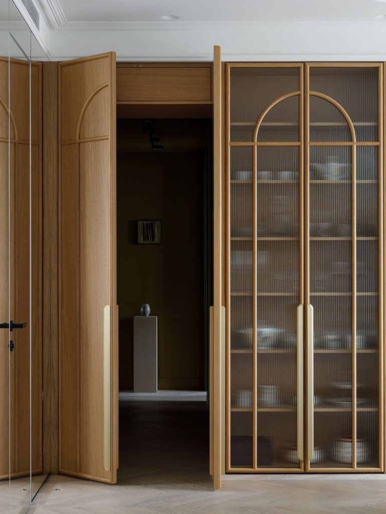 Особенностью дизайна стало оригинальное использование декоративной витринной системы в столовой зоне. Она скрывает незаметный проход в приватную часть квартиры, обеспечивая визуальное единство пространств. Вход в гостиничный санузел, расположенный прямо напротив обеденного стола, стал практически невидимым благодаря хитроумному решению с зеркальным покрытием стены, визуально растворяя дверь в окружающем пространстве.