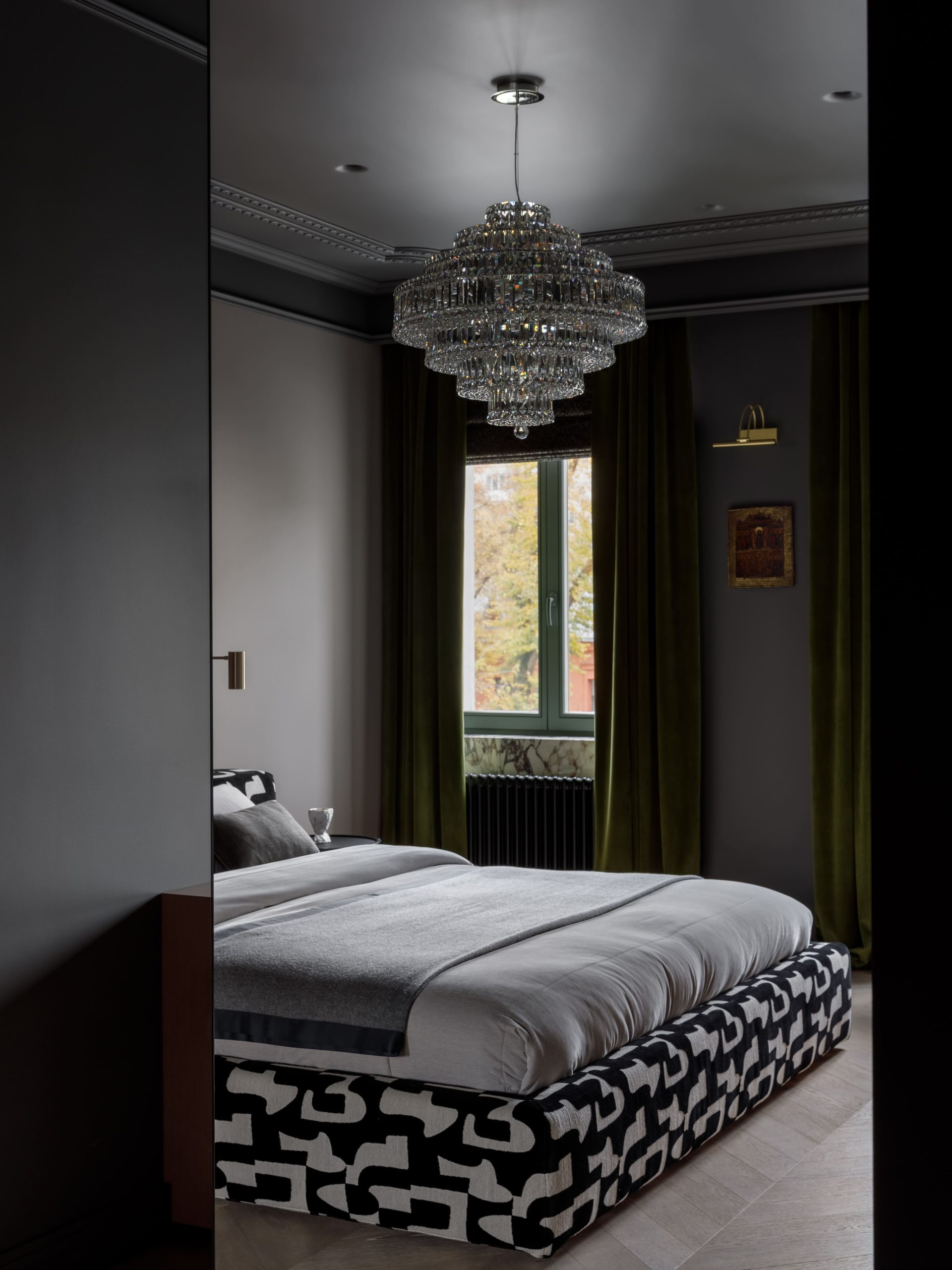 Интерьер дополняют винтажные настенные светильники, элегантные хрустальные люстры, экстравагантная кровать с необычным рисунком ткани, комоды и телевизионные тумбы необычной геометрии, изготовленные специально по нашему проекту. Основной тон стен — сочетание белого и нежного горчичного оттенка, создающее атмосферу тепла и света.