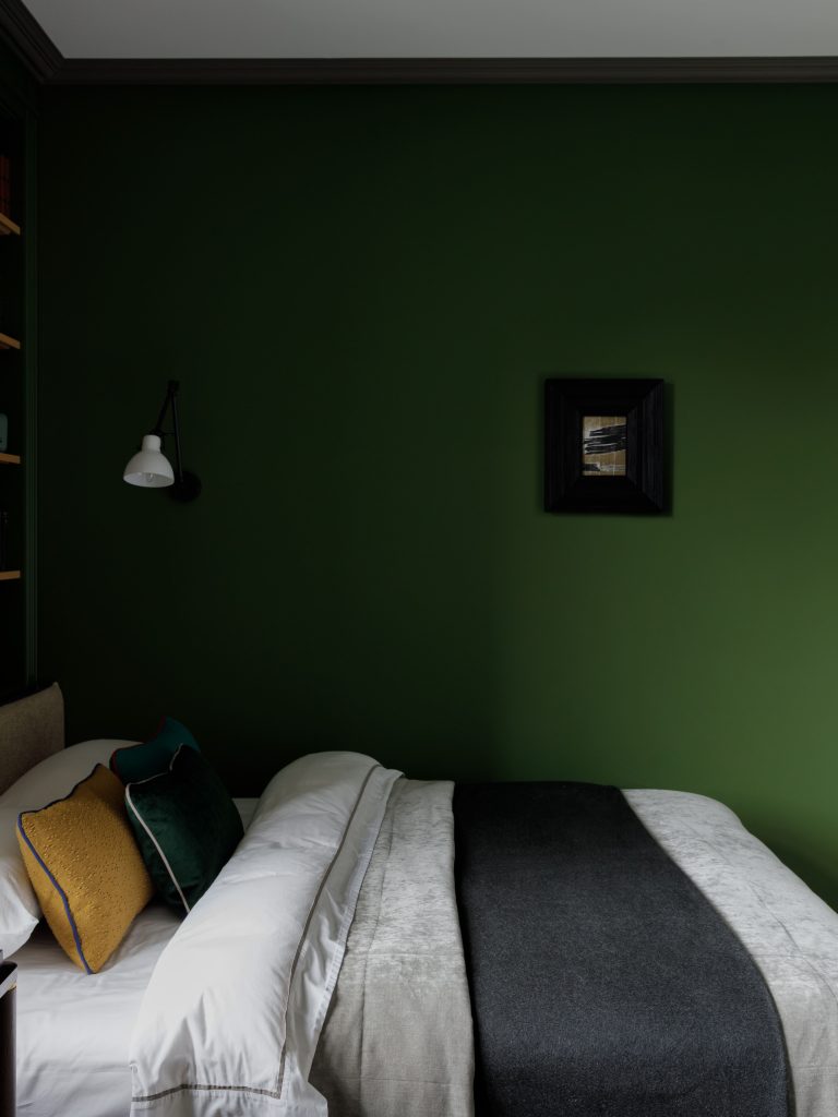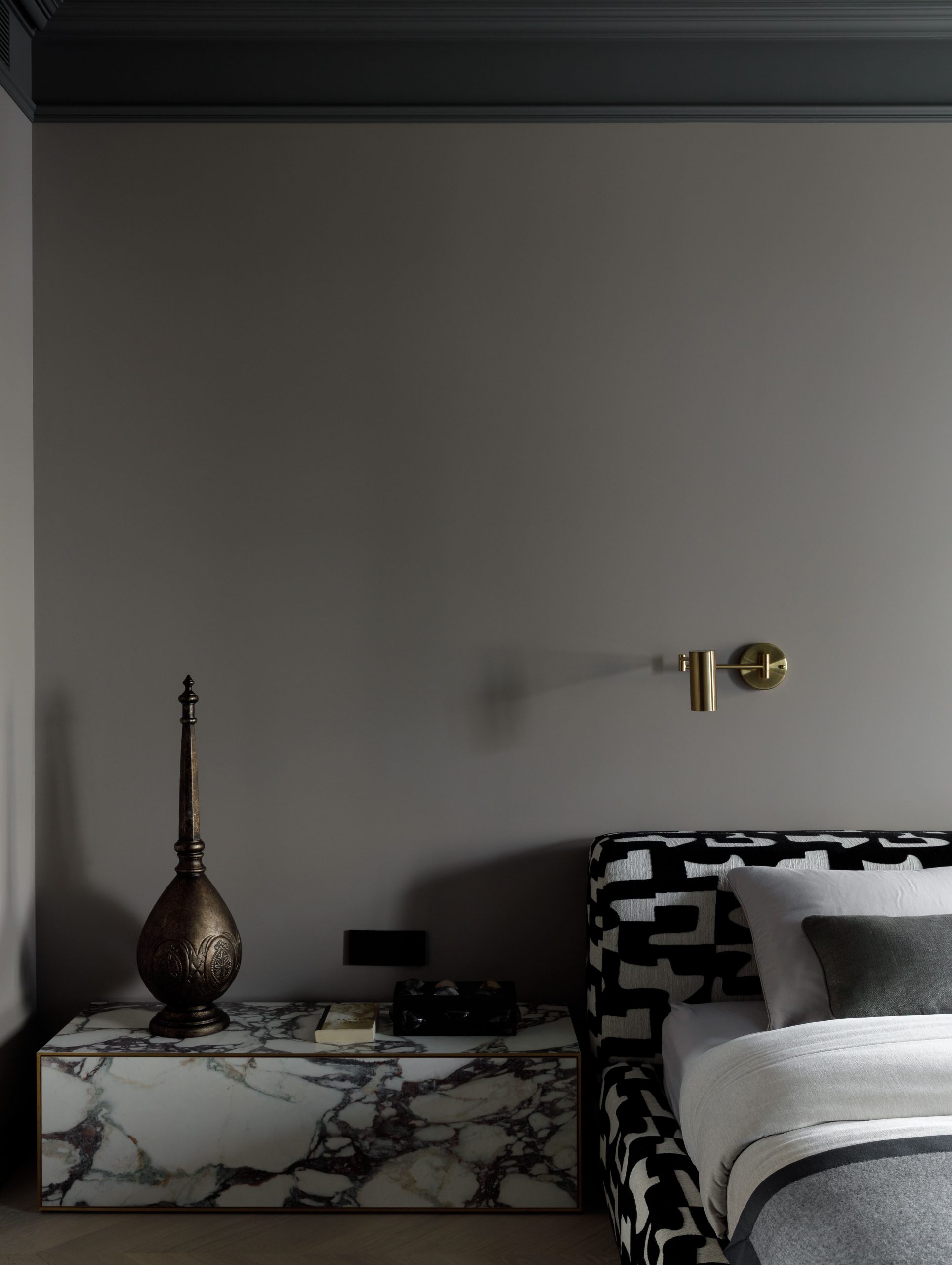 Спальная комната и ванная окрашены дымчато-серым цветом, привносящим ощущение спокойствия и гармонии.