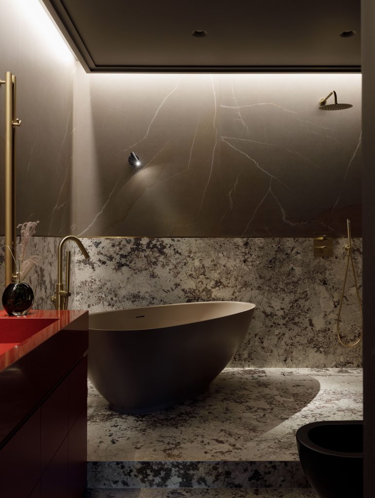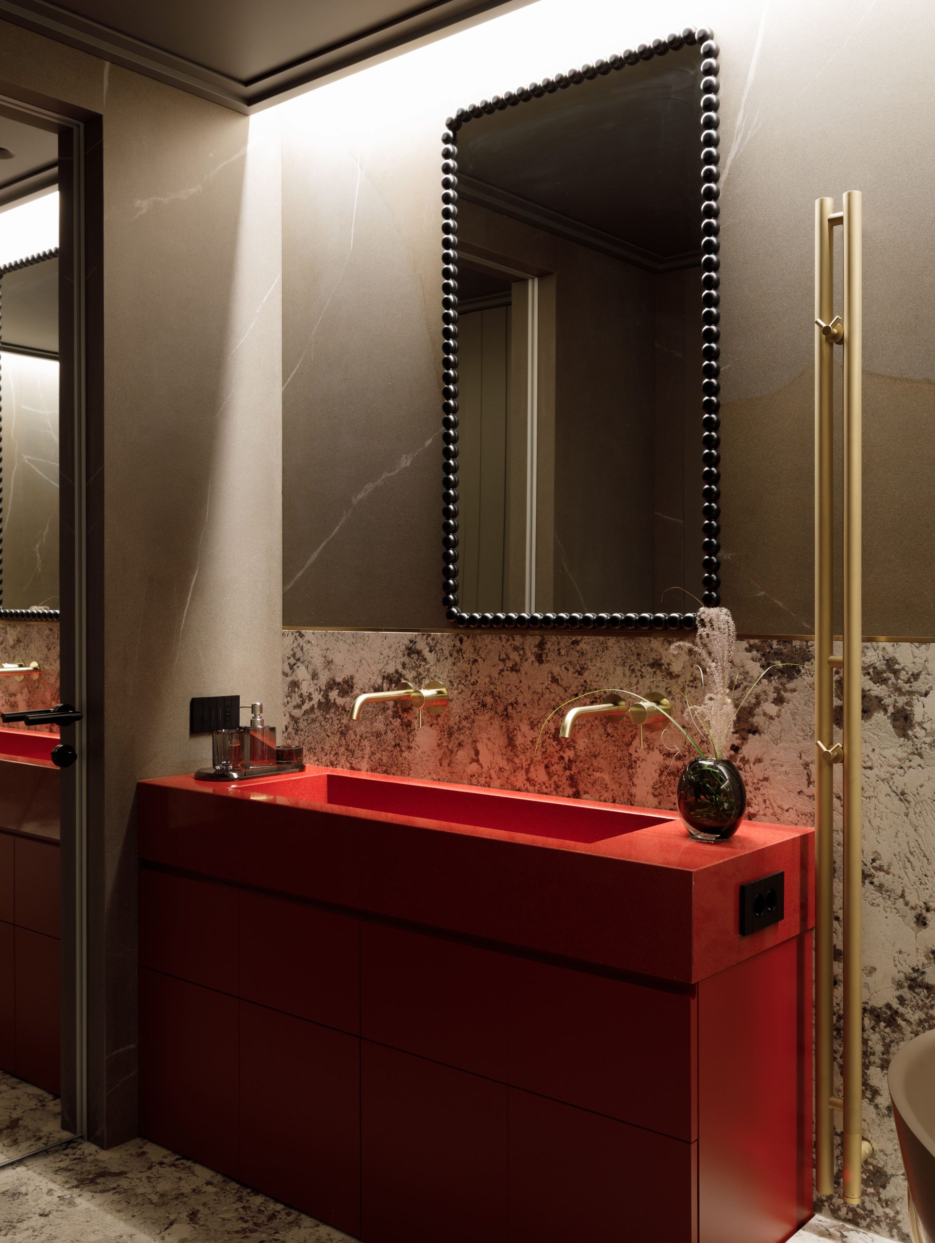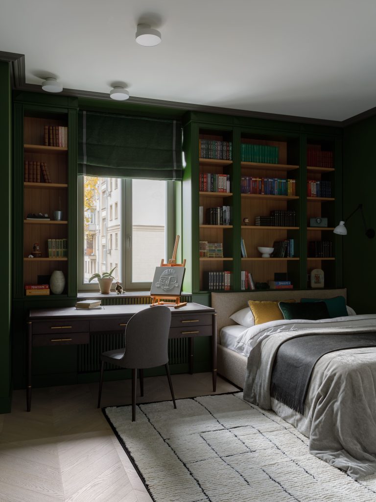 Ярким акцентом служит насыщенный красный оттенок, используемый точечно, подчёркивая индивидуальность пространства.