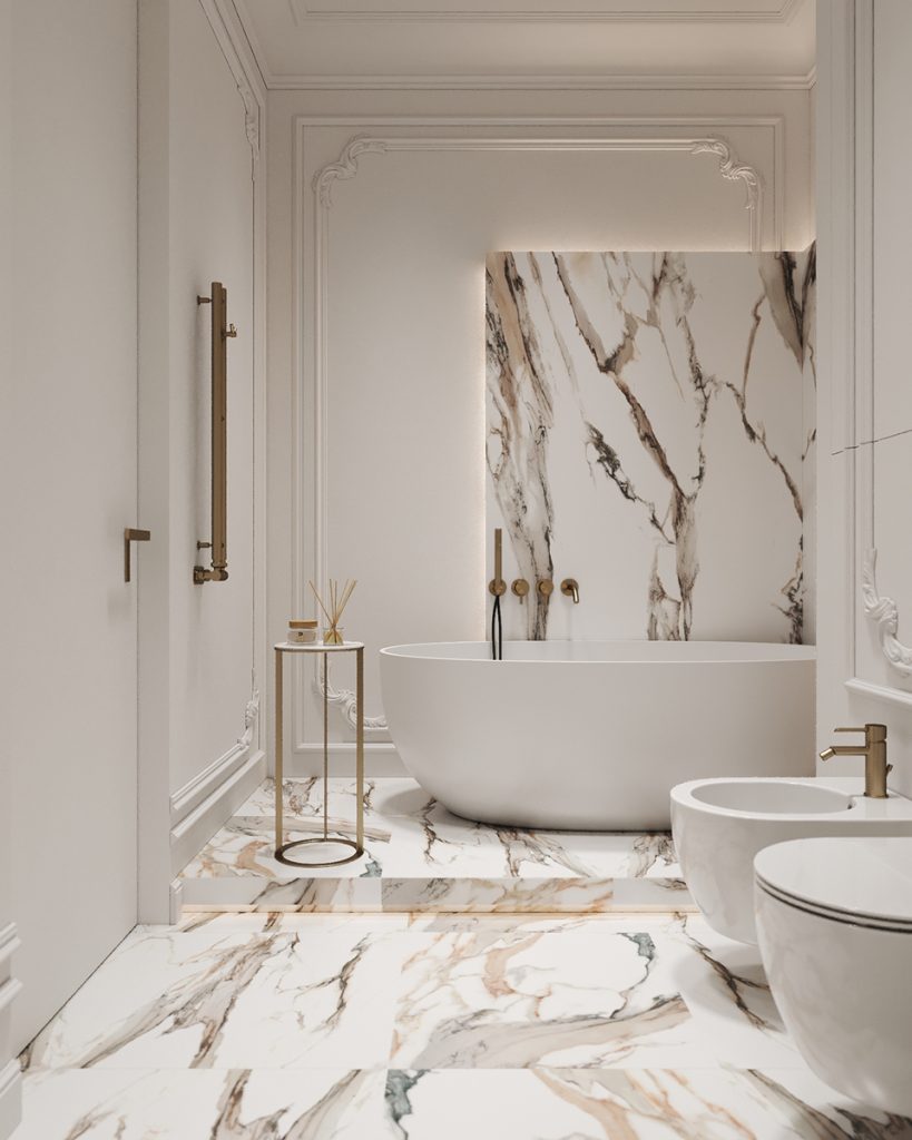 Гармонично соединили классическую элегантность и современные тенденции санузлы. Дерево наделило пространство благородной сдержанностью, а лаконичные линии сантехники подчеркнули красоту природной фактуры камня.