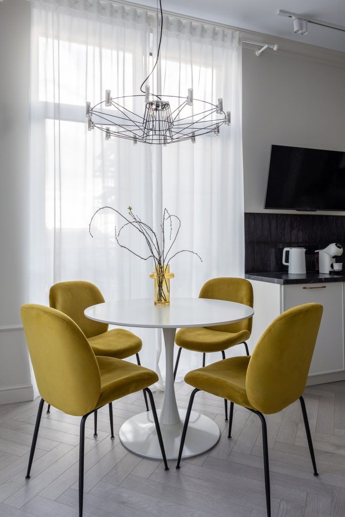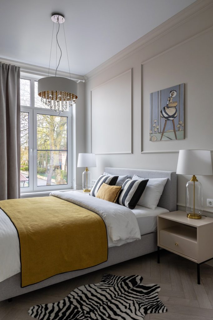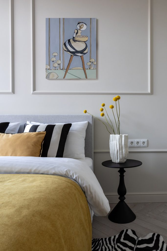 Подбирая мебель, автор проекта калибровала её в первую очередь по принципу практичности и лаконичности. Минималистичные формы не выглядят скучно, поскольку в пространство ввели запоминающиеся детали. Это и самобытный арт, и проработанные текстильные решения, и разнообразные светильники: от графичной люстры в столовой зоне до сложной конструкции в спальне с отсылками к ар-деко (что поддерживается ещё и имитацией шкуры зебры на полу).