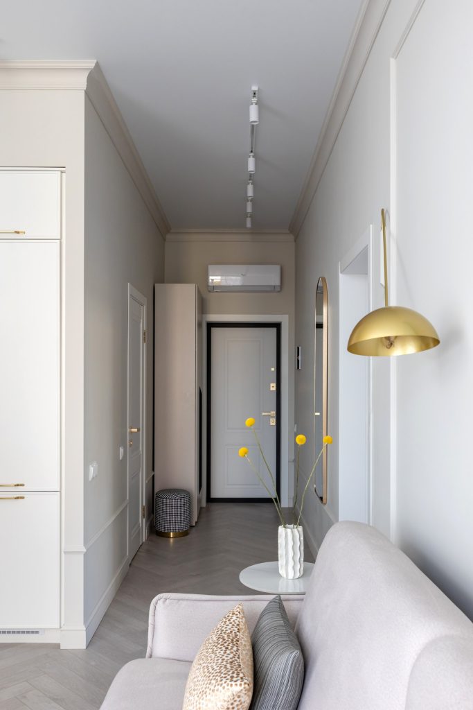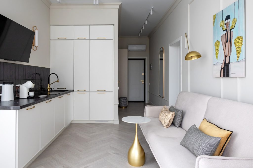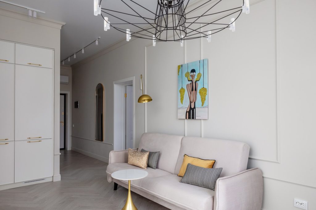 Сдержанная палитра — идеальное решение для подобных пространств: она даёт ощущение чистоты и лёгкости, присутствия свежего ветерка (окна в пол в общественной зоне умножают эффект). Светлый фон дружит с классическими элементами — от молдингов до традиционной «ёлочки» на полу: подобные мотивы всегда добавляют элегантности и изысканности. За позитивную энергетику отвечают золотые акценты: они делают пространство приветливым в любую погоду.