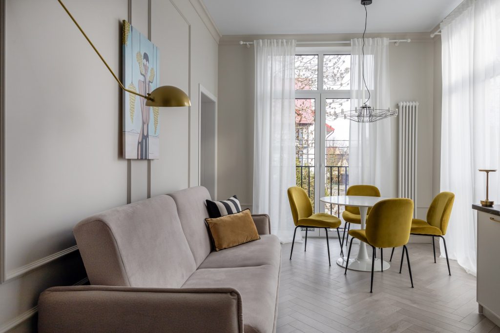 Сдержанная палитра — идеальное решение для подобных пространств: она даёт ощущение чистоты и лёгкости, присутствия свежего ветерка (окна в пол в общественной зоне умножают эффект). Светлый фон дружит с классическими элементами — от молдингов до традиционной «ёлочки» на полу: подобные мотивы всегда добавляют элегантности и изысканности. За позитивную энергетику отвечают золотые акценты: они делают пространство приветливым в любую погоду.