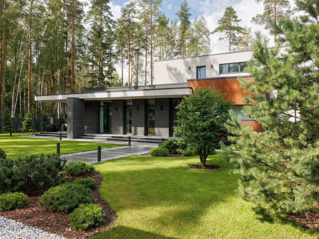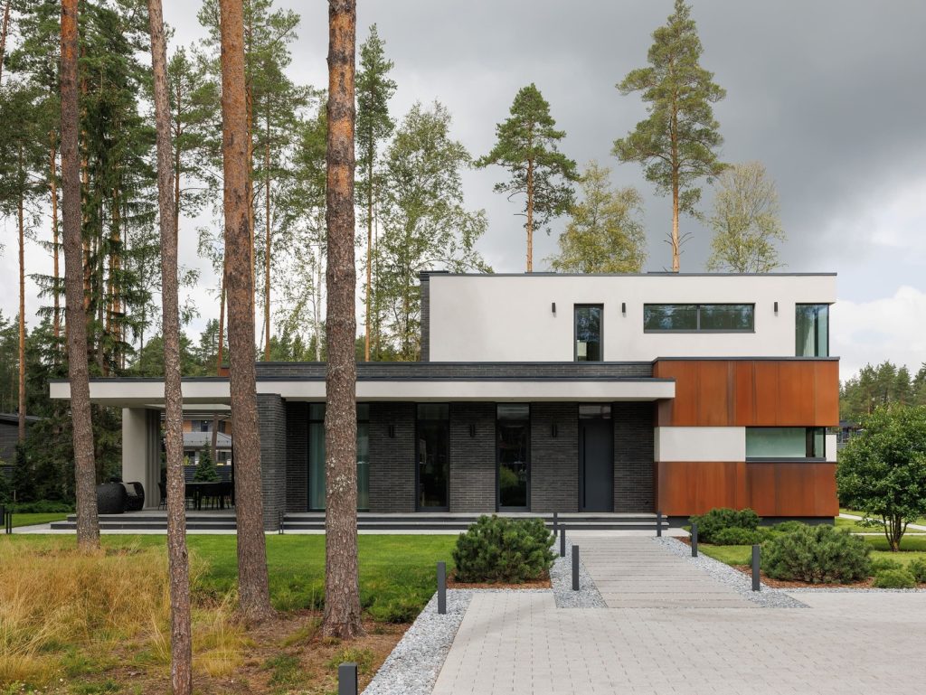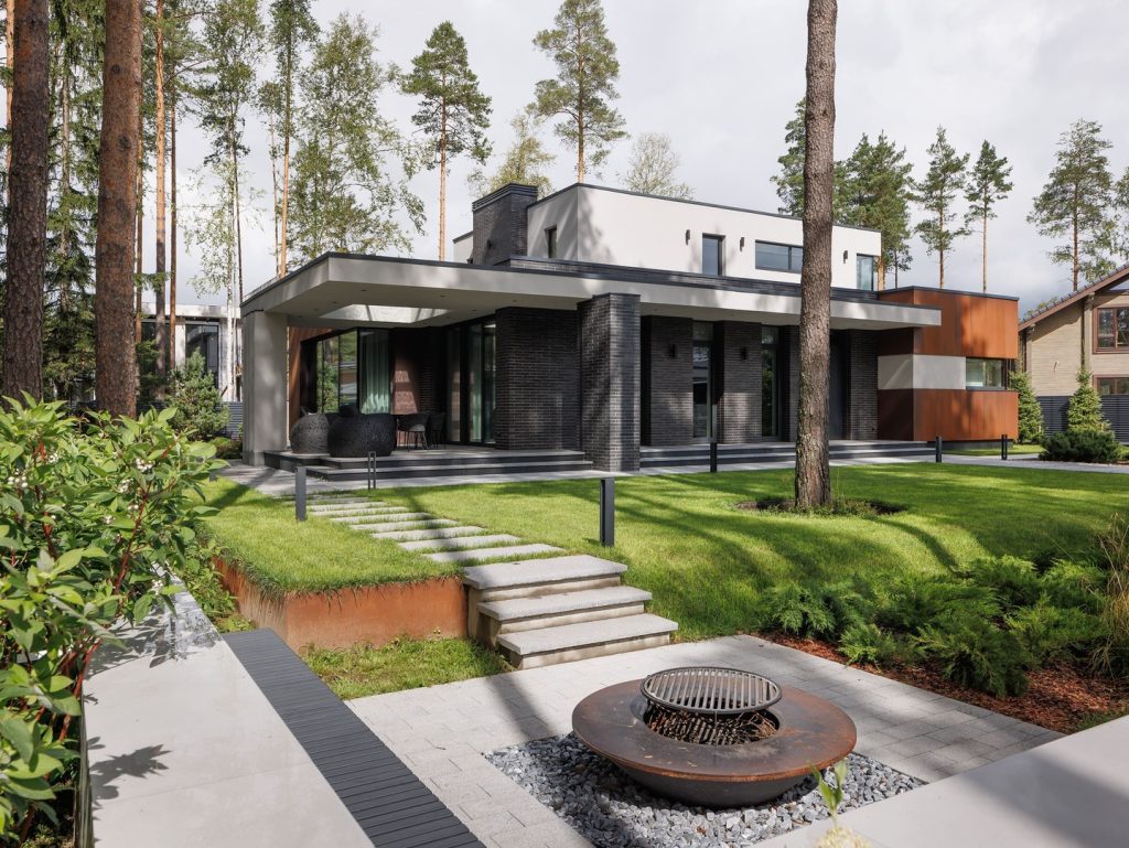 Игру объёмов Юлия Скачкова подчеркнула разной отделкой фасадов: серая штукатурка, чёрный кирпич, сталь-кортен. Здесь также сработало правило баланса красоты и функциональности. Кортен, долговечный и практичный, смотрится очень эффектно — всполохи тёплого оттенка приковывают внимание на фоне петербургского неба и перекликаются с цветом стволов сосен — их здесь немало, и, разрабатывая ландшафтное решение, команда студии сохранила деревья по максимуму.