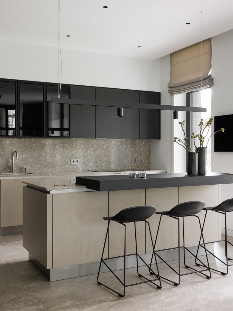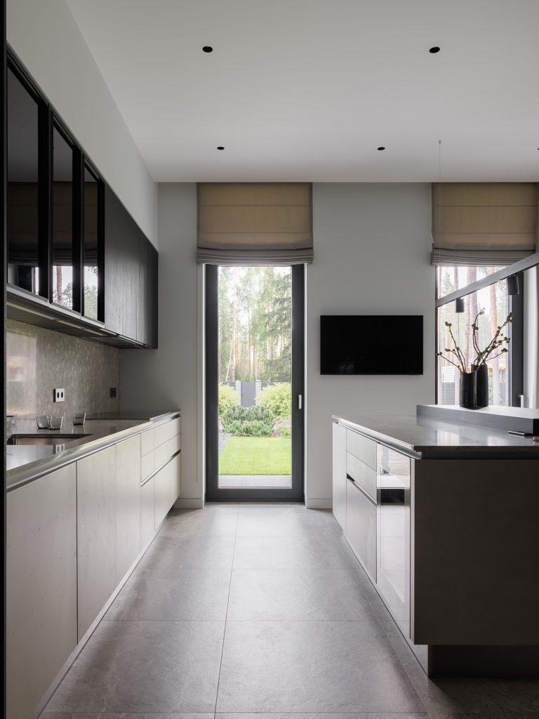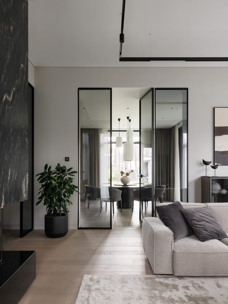 Кухню и столовую выполнили как единое пространство, отделив стеклянными перегородками, позволяющими «присутствовать» в гостиной, — любоваться камином или видеть экран ТВ. Если же хочется сосредоточиться на кулинарных экспериментах, двери можно закрыть.