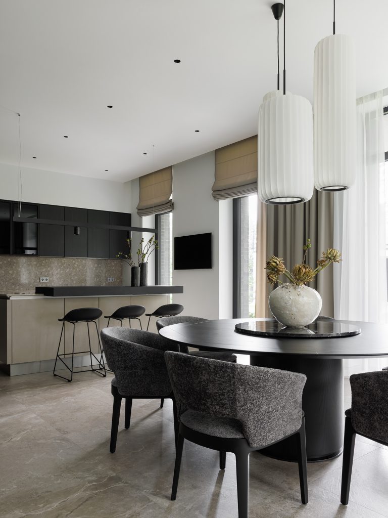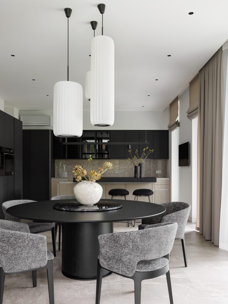 Большой круглый стол позволяет собрать за ужином компанию до 8 человек, а его круглая форма позволяет беспрепятственно выходить на террасу — в тёплое время года хозяева часто обедают там. Контрастное решение нашли для кухонного гарнитура: его фасады выполнены частично в тёмном обожжённом дереве, а частично — в штукатурке под бетон, причём это натуральная штукатурка, нанесённая вручную. Юлия Скачкова убеждена, что такой приём подхватывает ноты, звучащие в экстерьере, позволяет внешнему и внутреннему пространству проистекать одно из другого.