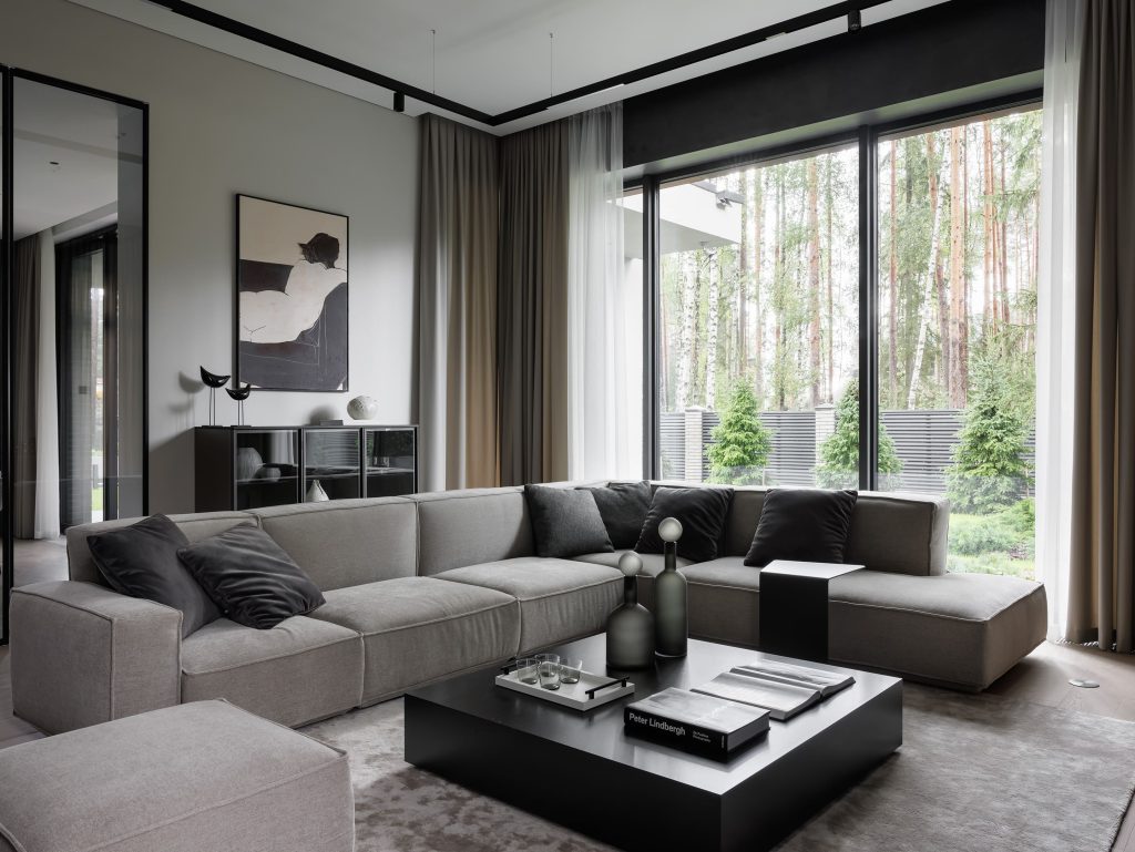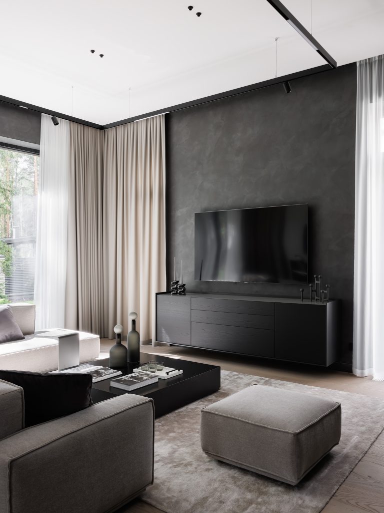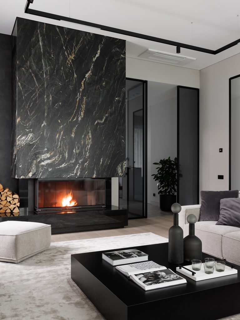 Лаконичность и архитектурность линий внешнего облика дома транслируется и в интерьере. Так, визуальным стержнем гостиной зоны стал трёхсторонний камин — довольно монументальная конструкция, которую можно видеть из разных уголков гостиной и даже из столовой. При этом Юлия Скачкова добилась эффекта удивительной лёгкости — камень словно взлетает над стеклом топки. Найти сплошной слэб было нелегко, камень с живописными прожилками привезли из Бразилии, но результат того стоил. Добавим, что приём использования консольных конструкций автор применила в проекте неоднократно: от выноса кровли над террасой и оформления лестницы до «парящего» камина и подвесных элементов мебели.