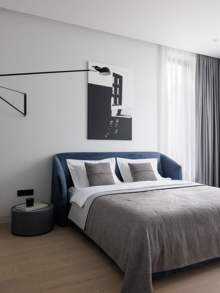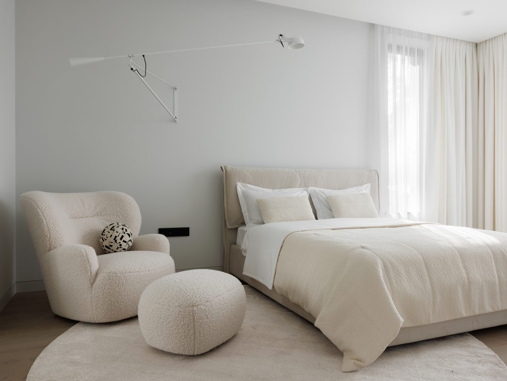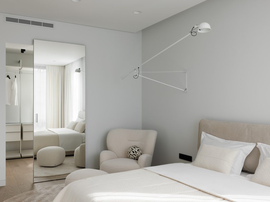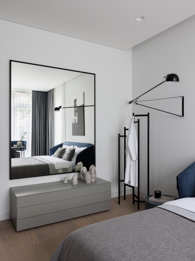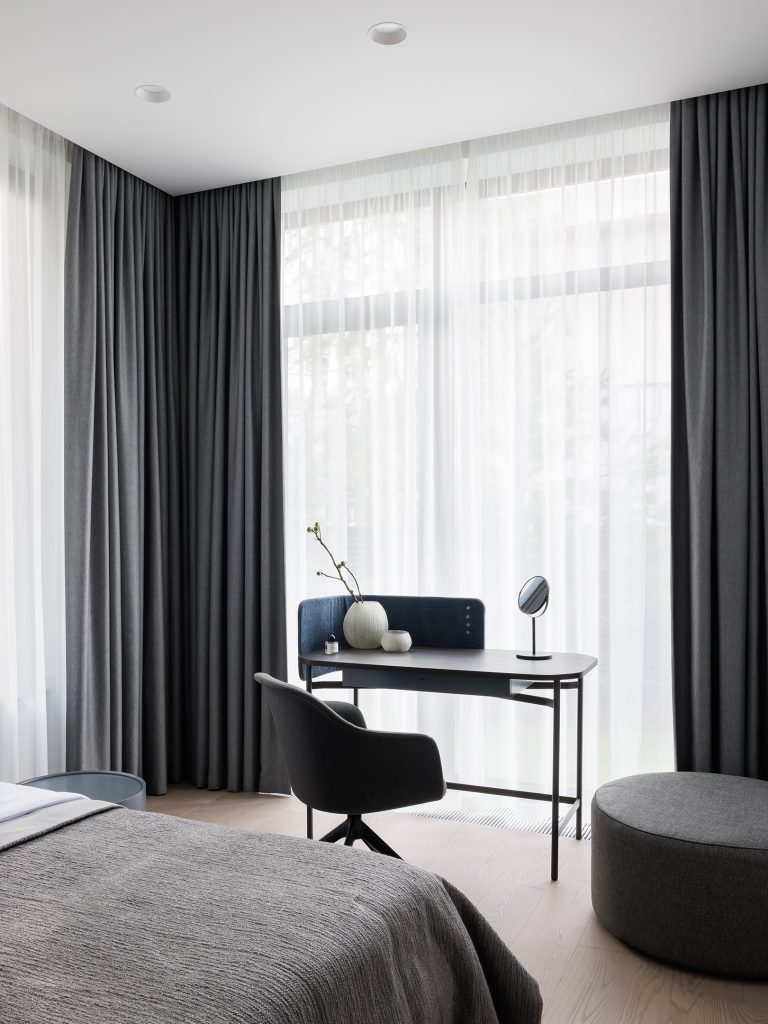 Мастер-блок отделили дополнительным коридором, изолировав его от шума. Меблировали спальню, исходя из принципа «необходимо и достаточно», использовали монохромную колористику, а добавить разнообразия помогли проработанные варианты освещения и обилие естественного света из больших витражных окон и небольшого окошка возле кровати.