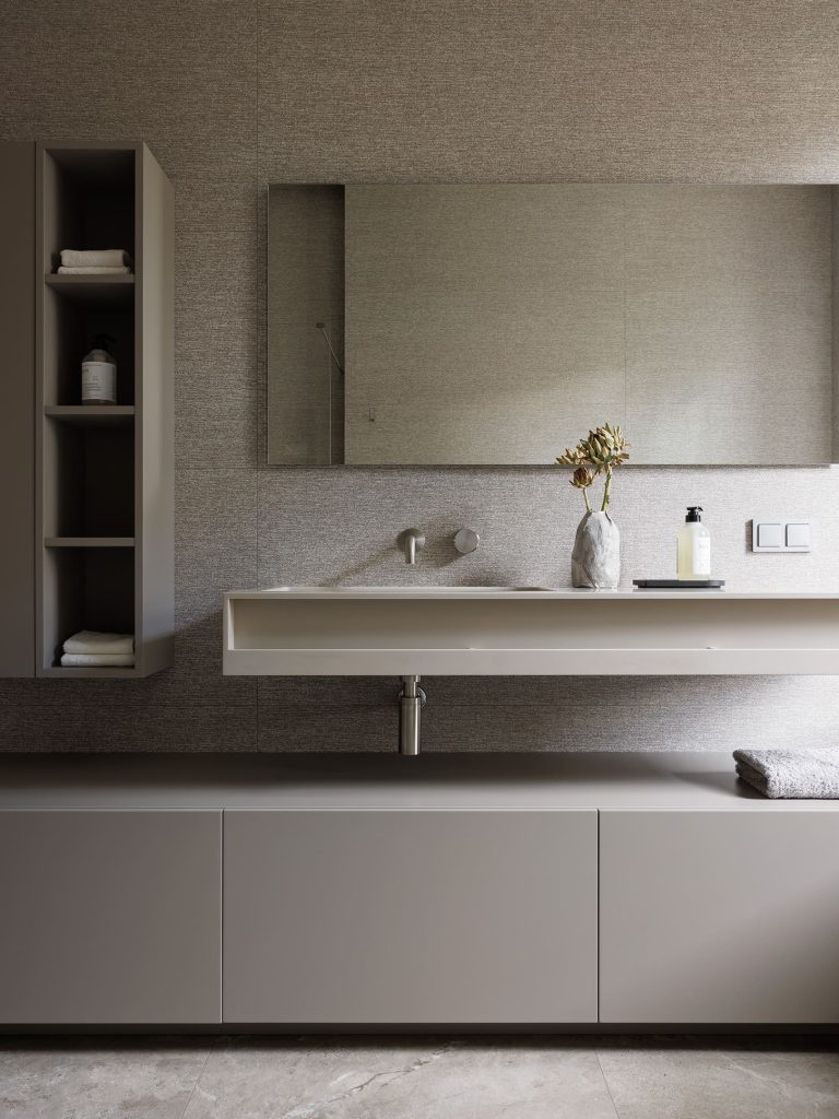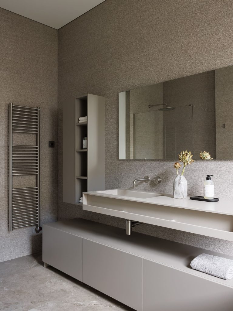 Отголоски общей интерьерной истории присутствуют и в отделке санузлов. Так, например, в санузле на втором этаже рифлёные стены дополнили светильником с рифлёным стеклом, а на лестнице можно увидеть дизайнерский радиатор с рифлением. Такие аналогии всегда придают пространству монолитность и органичность.