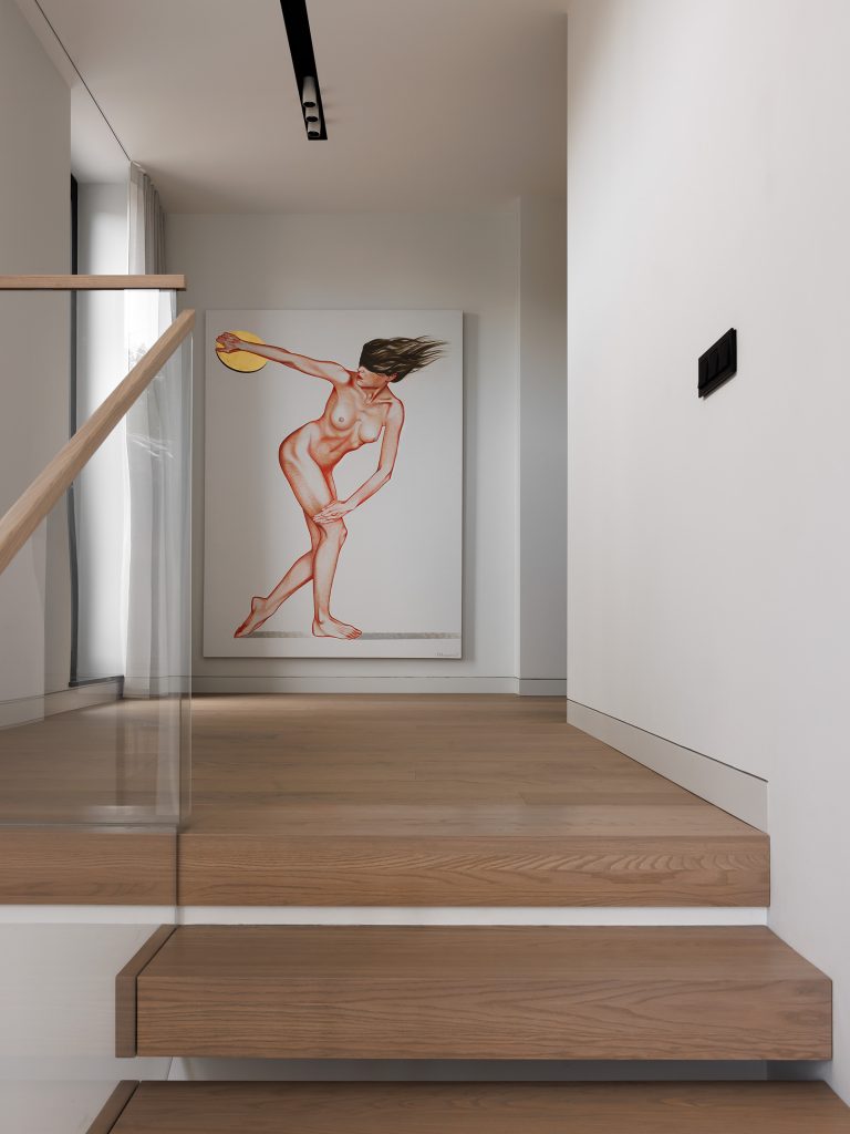 Чтобы задать интерьеру определённую энергетику, Юлия Скачкова особое внимание уделила арту. Например, над лестницей появилось написанное специально для проекта полотно Маши Янковской — его художница выполнила в традиционной для себя манере, но отразила ценности хозяев дома: в динамичных линиях чувствуется сила духа и тела, целеустремлённость и гармония.