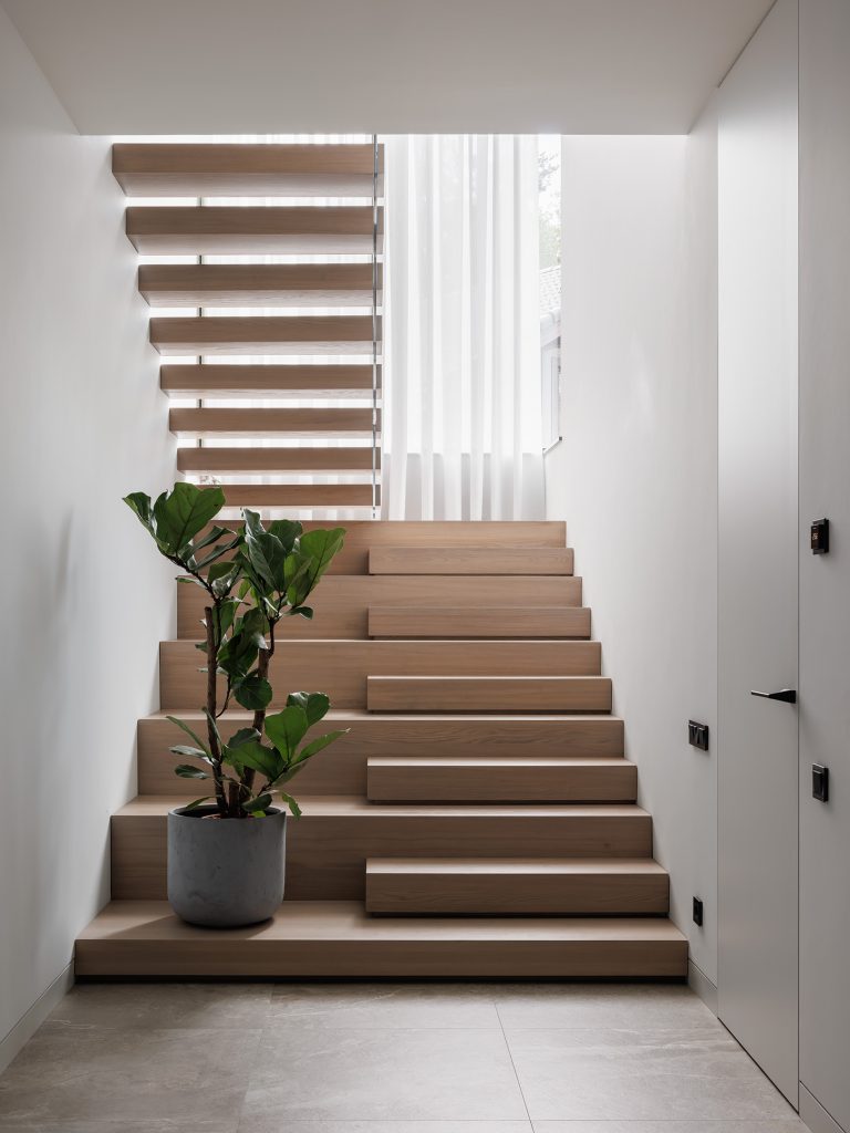 О лестнице стоит сказать особо — её конструктив продуман до мелочей. Поток света из окна и значительное расстояние между консольными ступенями делают её визуально лёгкой и позволяют свету проникать во входную зону, наполняя пространство уютом и дружелюбием.