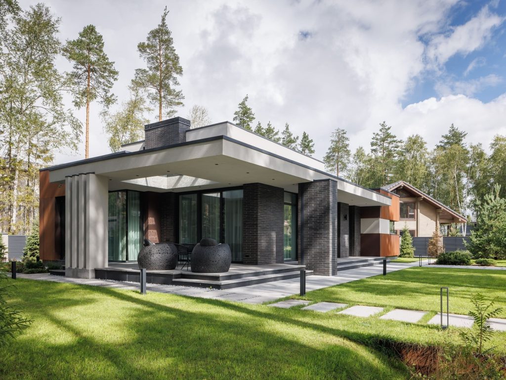 Игру объёмов Юлия Скачкова подчеркнула разной отделкой фасадов: серая штукатурка, чёрный кирпич, сталь-кортен. Здесь также сработало правило баланса красоты и функциональности. Кортен, долговечный и практичный, смотрится очень эффектно — всполохи тёплого оттенка приковывают внимание на фоне петербургского неба и перекликаются с цветом стволов сосен — их здесь немало, и, разрабатывая ландшафтное решение, команда студии сохранила деревья по максимуму.