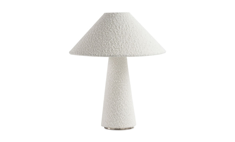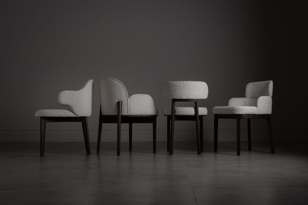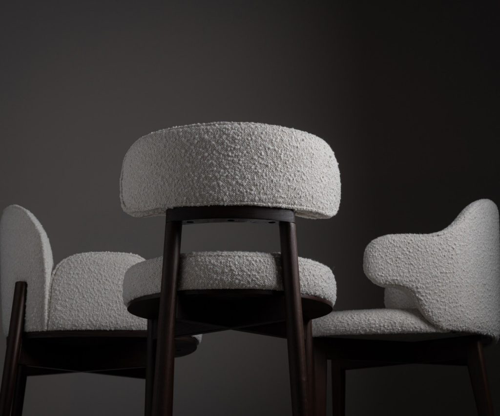Буклированная мебель активно добавляет тактильную составляющую в инсталляцию – причем тканью обиты не только диван, кресло и стулья, но из нее сделана и необычная настольная лампа Ivy, которая благодаря материалу сама похожа на небольшой арт-объект. Два ковра – один графичный, другой розоватый – связывают воедино обстановку и живопись.