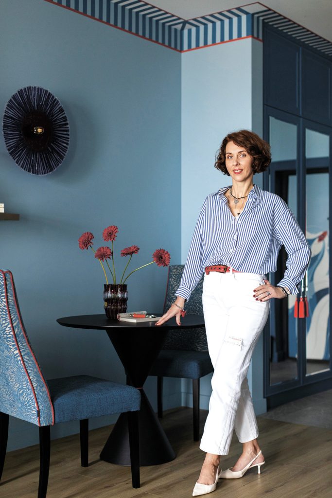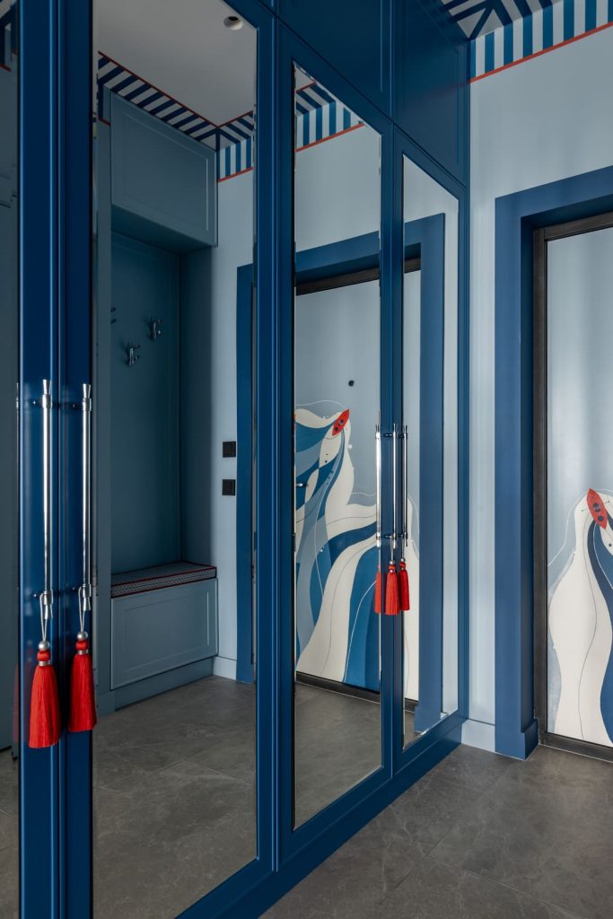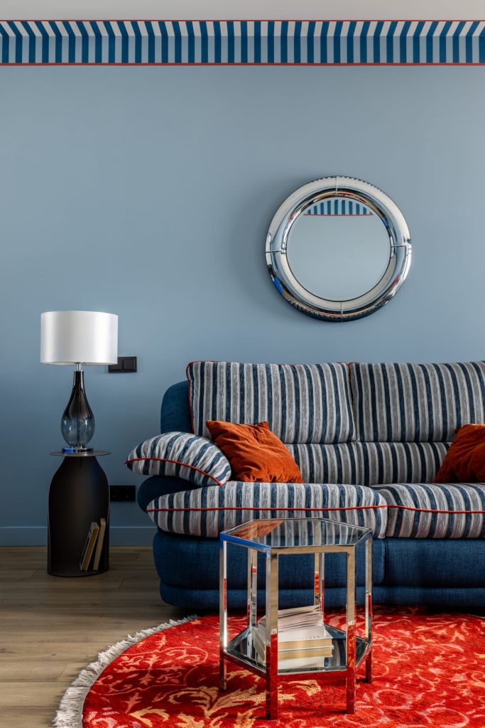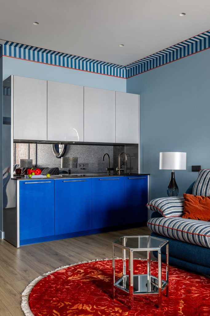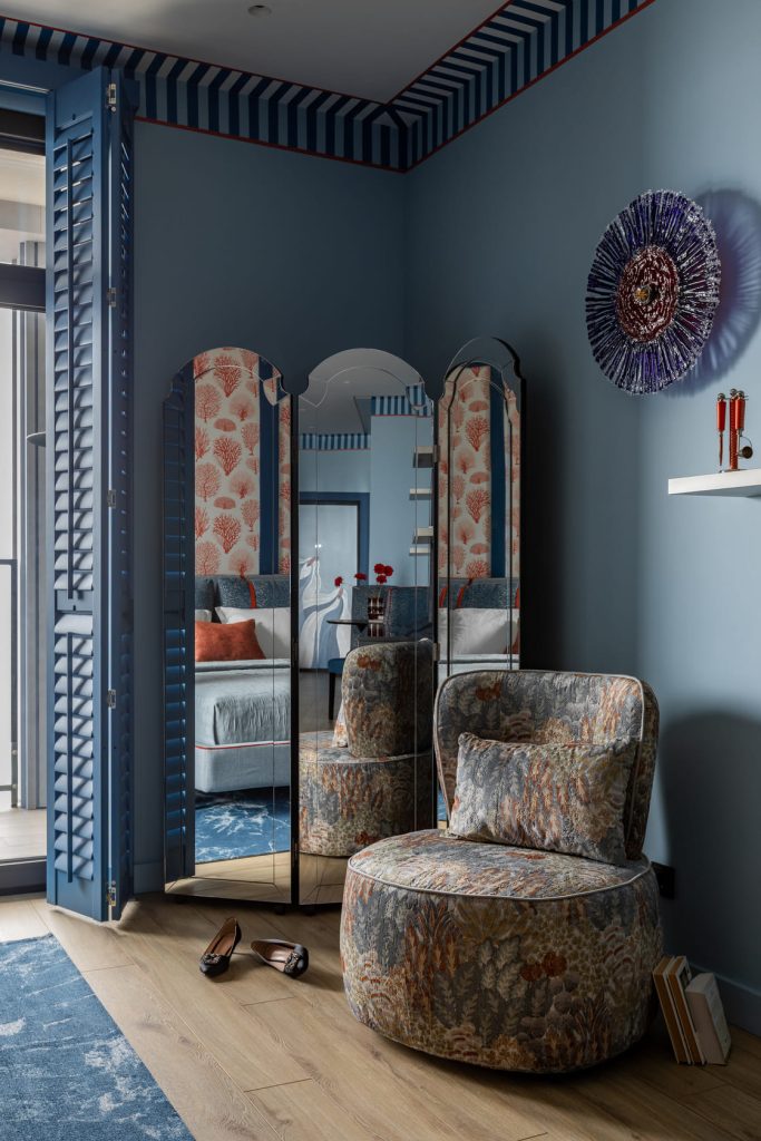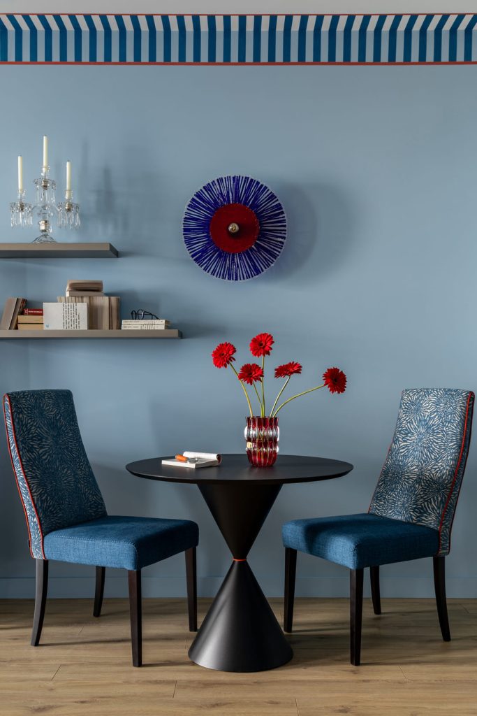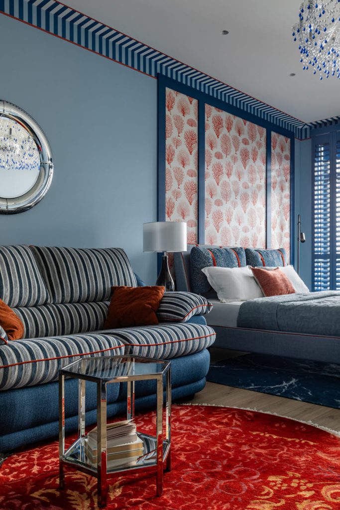 Дизайнер уверена: цвет — это один из самых доступных и вместе с тем многофункциональных инструментов дизайнера. Автор проекта виртуозно поработала с палитрой, наполнив общественную зону сочными оттенками синего и красного и немного снизив градус интенсивности цвета в спальне, где нужна более спокойная и умиротворяющая атмосфера.