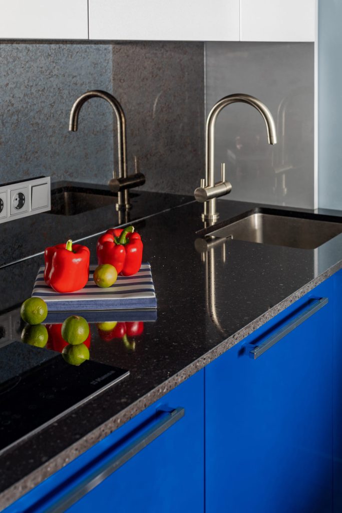 Колористика тоже получилась традиционной, причём Елена Чигирёва не боялась ярких тонов. Например, нижние шкафчики кухонного гарнитура сделали насыщенно-синими, немного «усмирив» их тёмной кухонной столешницей из чешского кварцевого агломерата Technistone Terazzo Dark.