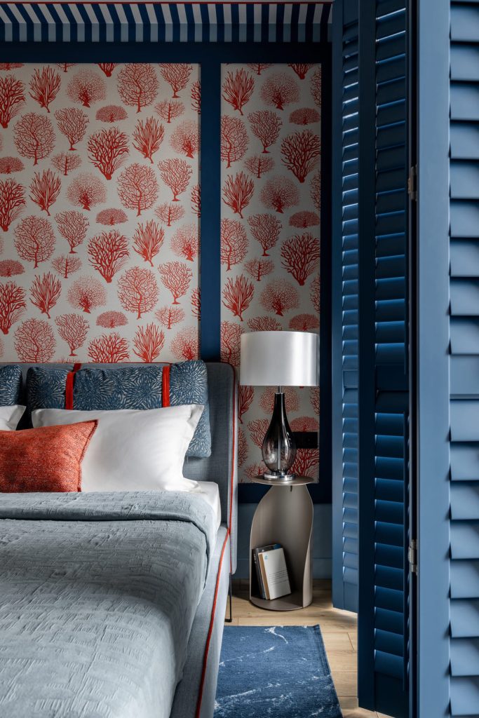 «Сделать объект эмоциональным, самобытным и запоминающимся помогает авторский декор», — делится опытом Елена Чигирёва. В этом проекте декоративные решения тоже подчинены общему курсу и вдохновлены морской стилистикой. Люстра с каплями-подвесками, оформление акцентной стены в спальне орнаментом с кораллами, ковёр, ассоциирующийся с пеной на волнах, тематическая роспись входной двери… Даже тумба под ТВ — это благородный и элегантный, но всё же узнаваемый парафраз кованого пиратского сундука. Интересное и творческое переосмысление традиционных мотивов позволило создать гармоничный и выразительный интерьер, наполненный яркими эмоциями и волной позитива, что идеально соответствует отпускному настроению.