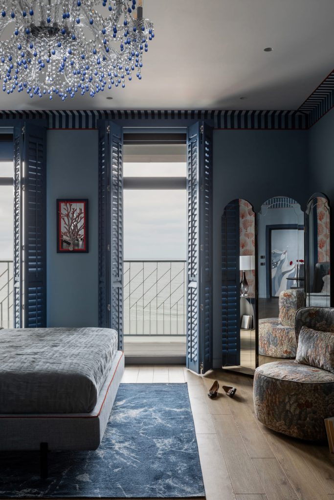 С таким запросом идеально совпал главный естественный акцент интерьера — поскольку квартира расположена на первой береговой линии, из окон открывается впечатляющий вид на Балтийское море. Поэтому морская эстетика буквально «наводнила» пространство: полоски, кораллы, хрустальная люстра и шаттерсы на окнах — все эти элементы поддерживают круизную тему.