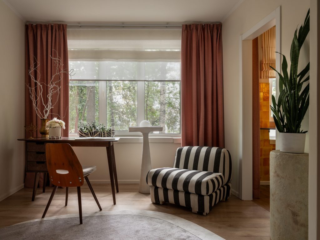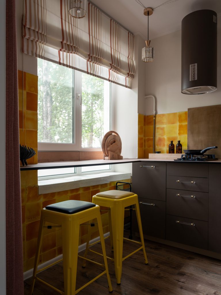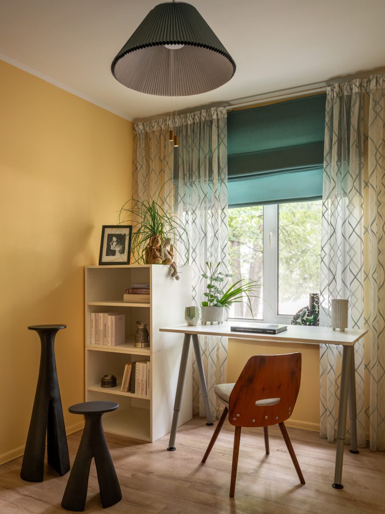 Его автором стала талантливый предметный дизайнер Настасья Дуленко. Основная задача состояла в сохранении атмосферы прошлого, используя элементы старой семейной мебели, которую владельцы хотели оставить в память о своей любимой бабушке, вместе с созданием современной, удобной обстановки.