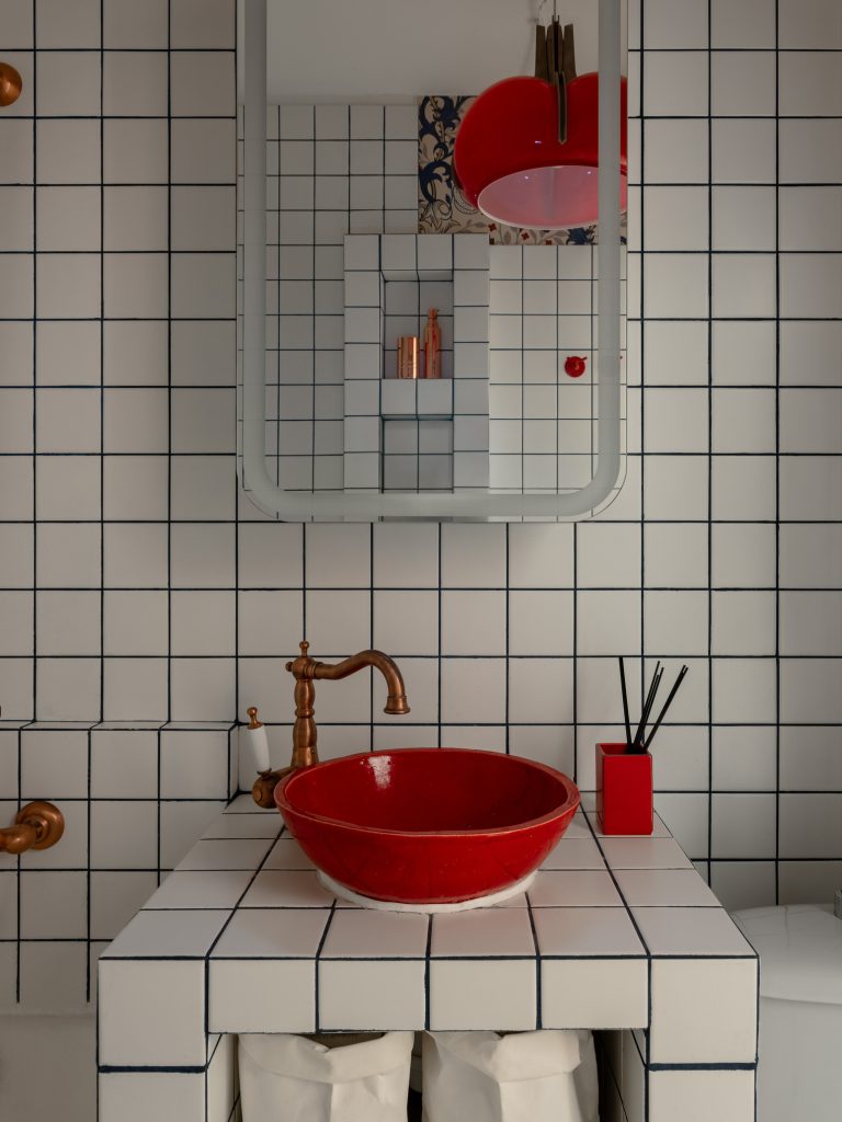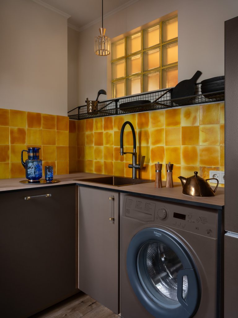 Главные акценты расставлены именно там, где хотелось подчеркнуть уникальность и характер пространства. Так, ярким пятном стали ванная комната и кухня, выполненные в ярких насыщенных цветах, тогда как спальня-гостиная отличается большей простотой и минимализмом.