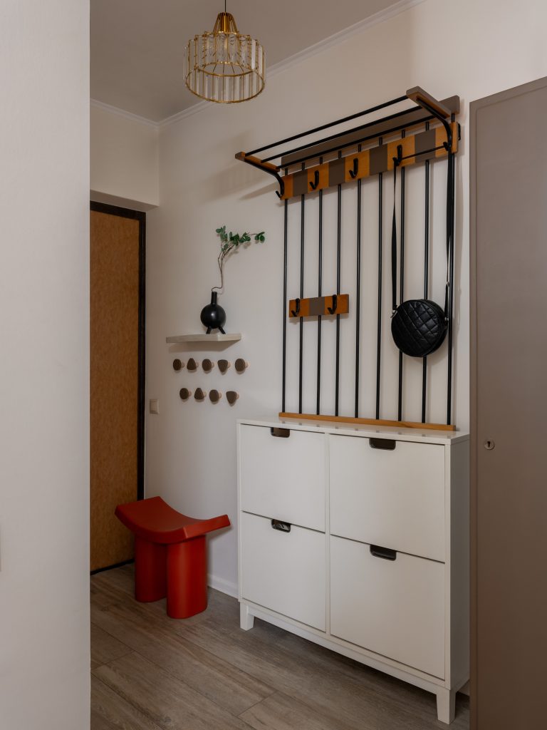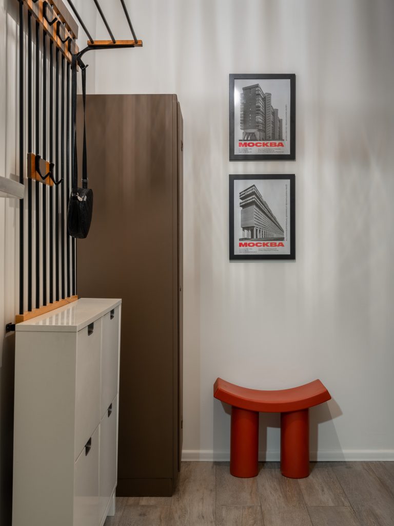 Особое внимание уделено деталям, ведь помимо эстетики, квартира должна была оставаться функциональной даже несмотря на наличие проходной комнаты. Благодаря этому решению каждый сантиметр площади использован рационально, а жилые зоны грамотно распределены.
