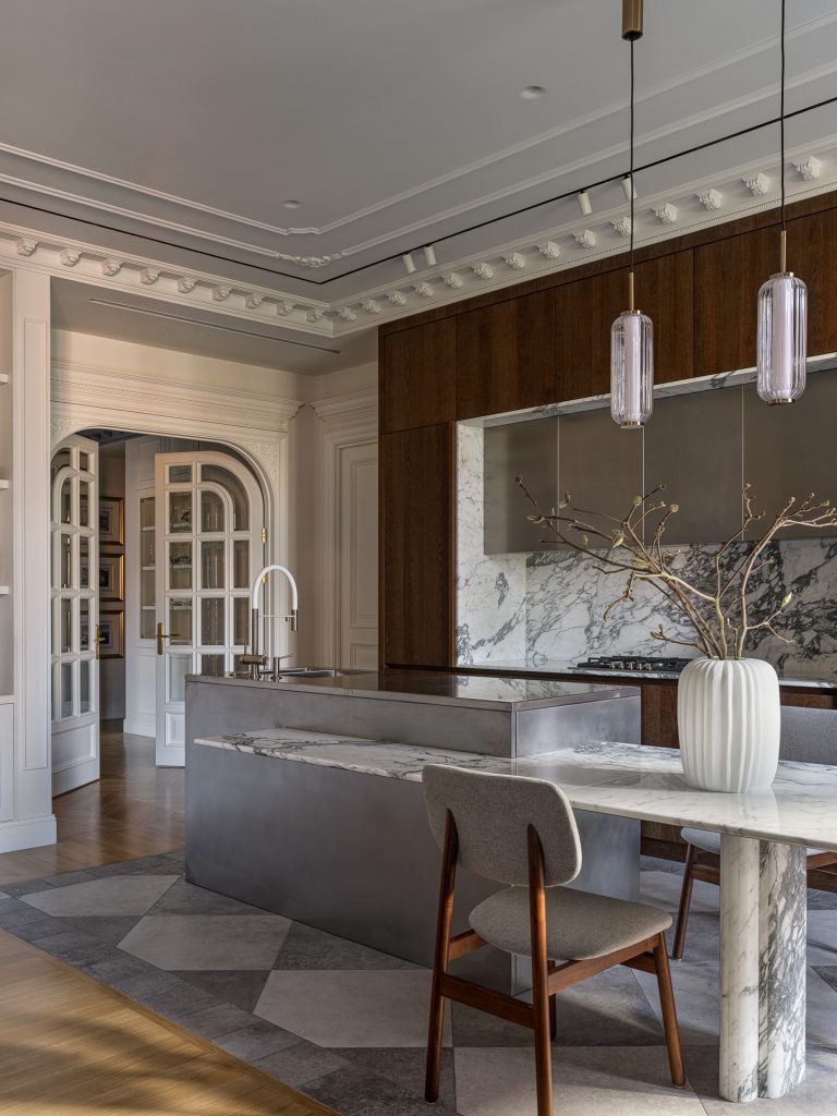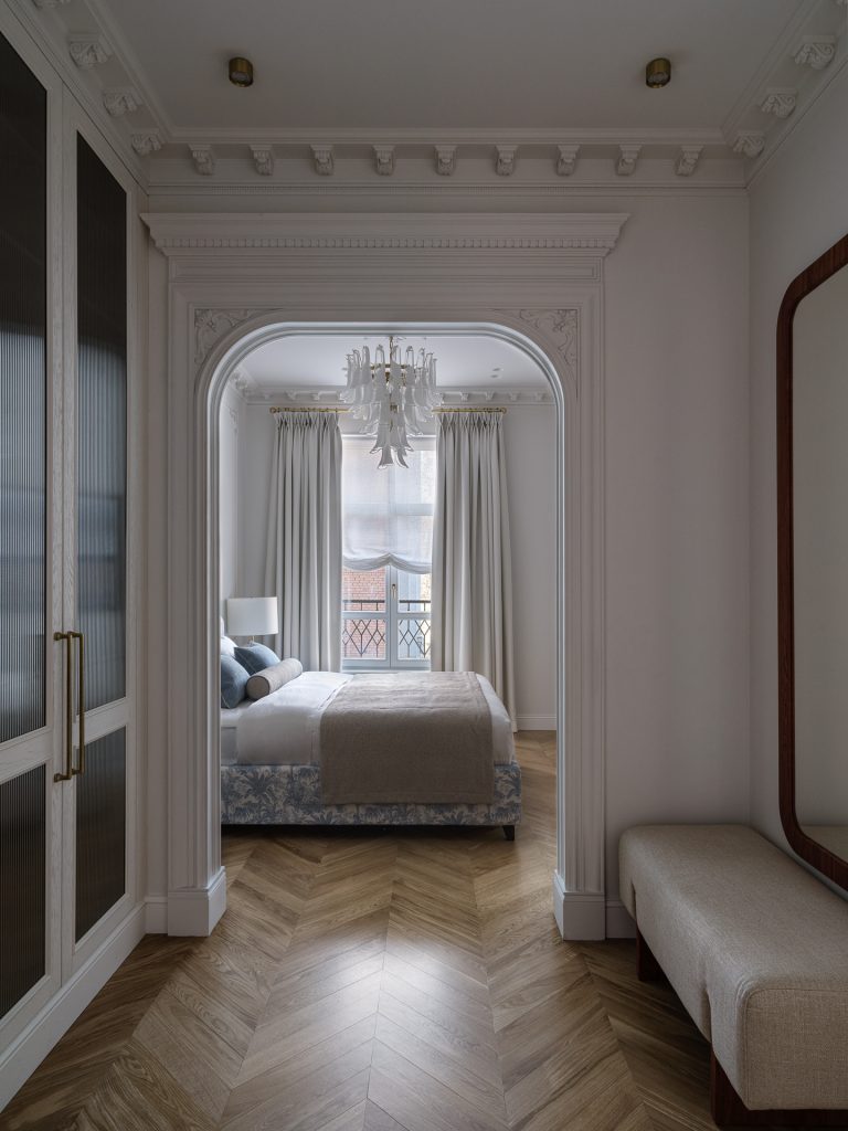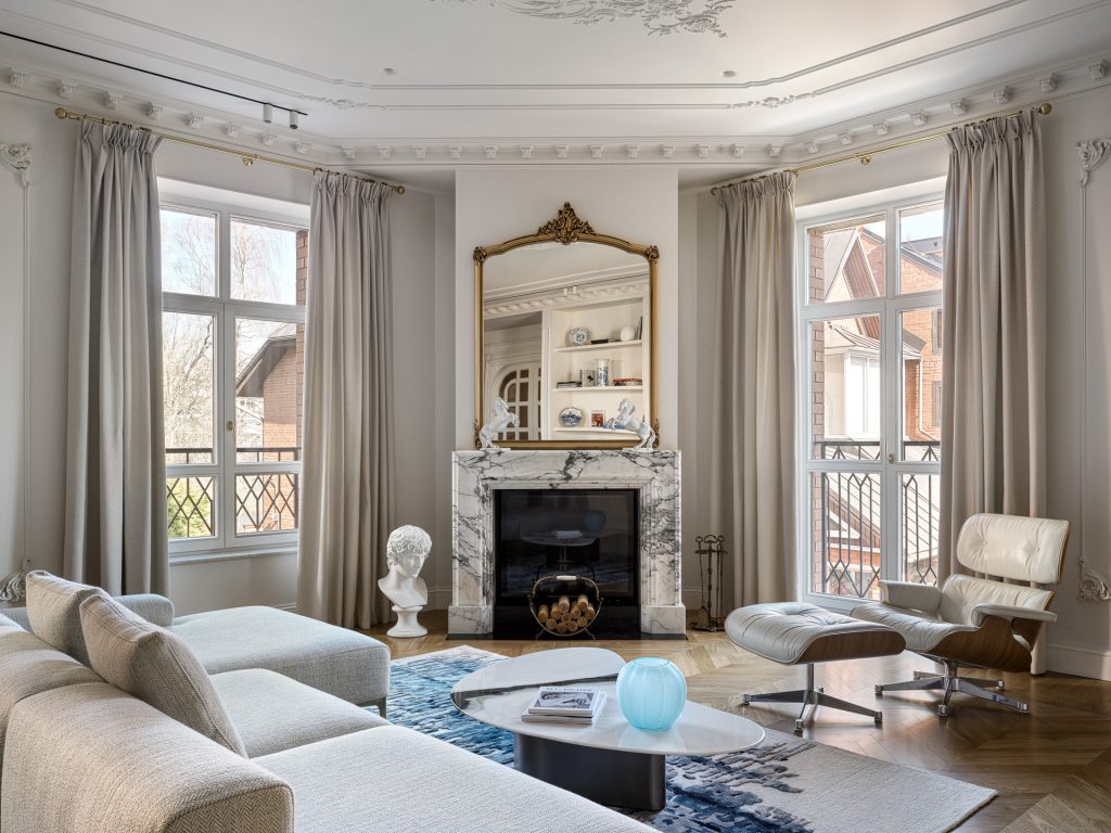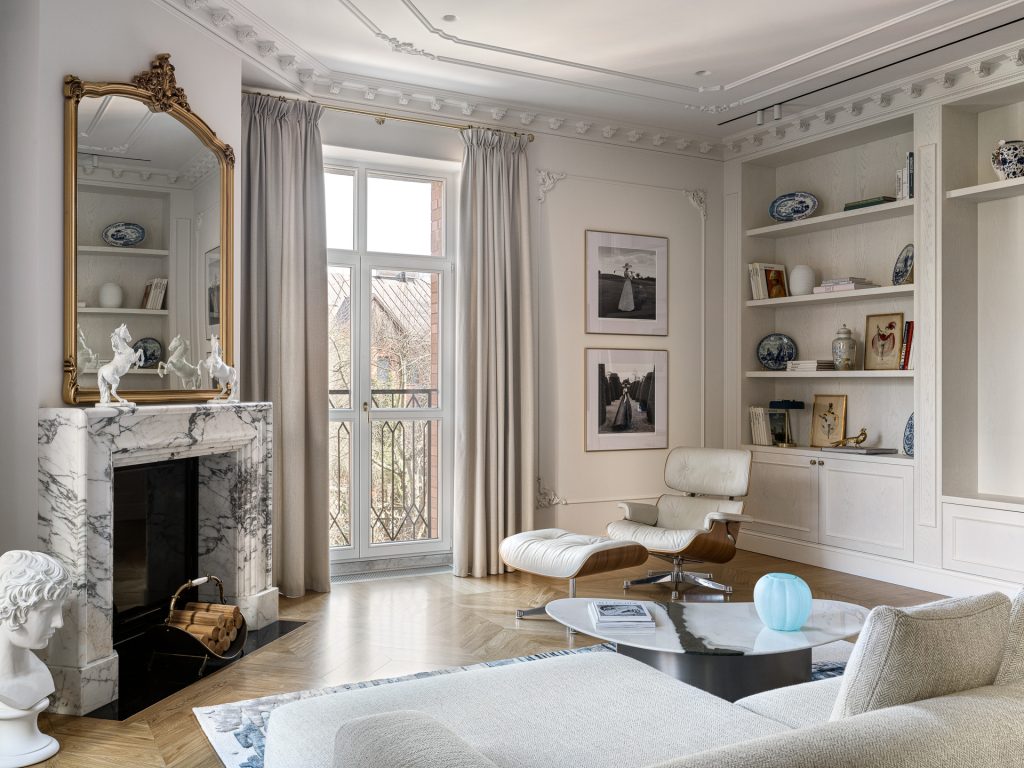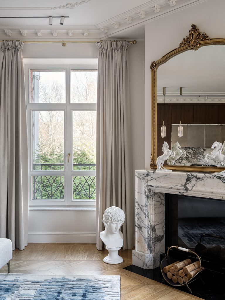 В гостиной царит парижский шик: традиционные элементы здесь соединяются с лаконичными современными предметами, а изящная «окантовка» — лепнина и резные рамы, сандрики и розетки — добавляет пространству артистичности и шарма.
